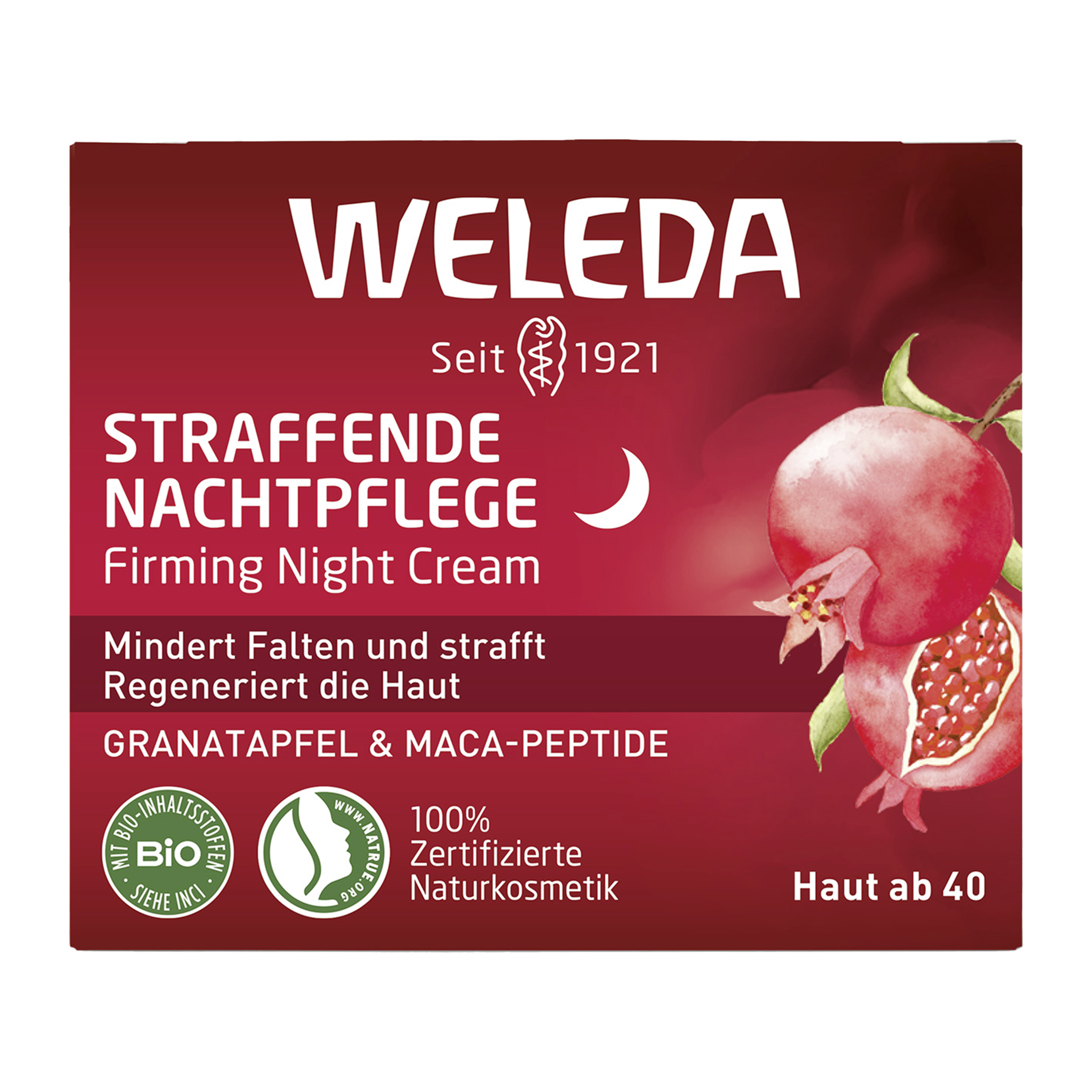 Zpevňující noční krém s olejem z granátových semínek, maca-peptidy a vyšším podílem lipidů pleť dokonale regeneruje, vyživuje a viditelně vyhlazuje vrásky. Výsledkem je výrazně vypnutější a odpočatější pleť během noci. Noční krém se rychle vstřebává bez pocitu mastnoty a je vhodný pro použití pro všechny typy pleti. Regenerační složení pro pevnější pleť, která vypadá odpočatě a rozzářeně. Organický olej z granátového jablka a Maca-Peptidy pleť aktivně regenerují během noci. Pokožka je hydratovaná a pružnější.