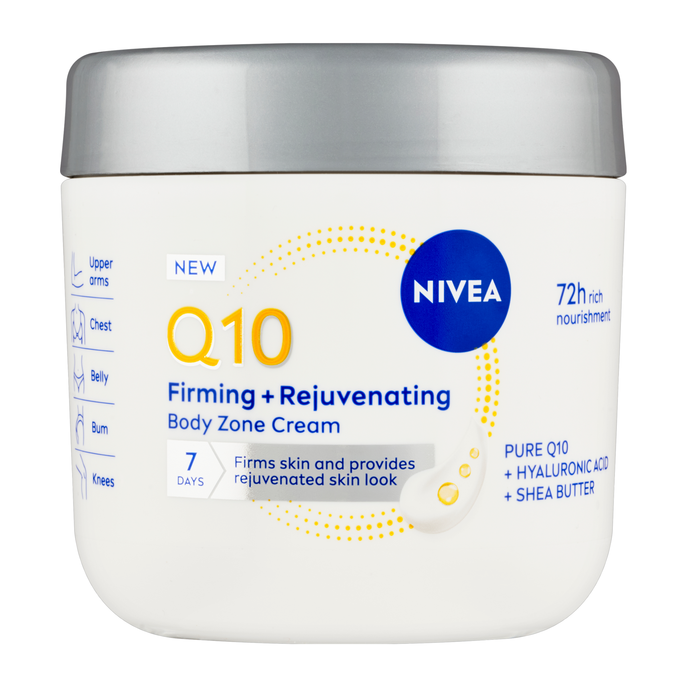 Trápí vás povolená a mdle vypadající pokožka? Vyzkoušejte novinku od NIVEA Zpevňující a remodelační krém, který je speciálně vyvinutý pro obzvlášť problémové partie. Viditelně zpevňuje pokožku na bříšku, zadečku i dekoltu. Obsahuje čistý koenzym Q10, který stimuluje tvorbu kolagenu a působí také jako silný antioxidant. Kyselina hyaluronová a bambucké máslo pokožku hloubkově vyživují a hydratují až na 72 hodin. Výsledkem je už za 7 dní viditelně pevnější a mladistvěji vypadající pokožka, která je vypnutá a na dotek hebká. Zpevňující krém je vhodný pro všechny typy pokožky a seženete ho ve výhodném 400ml balení.