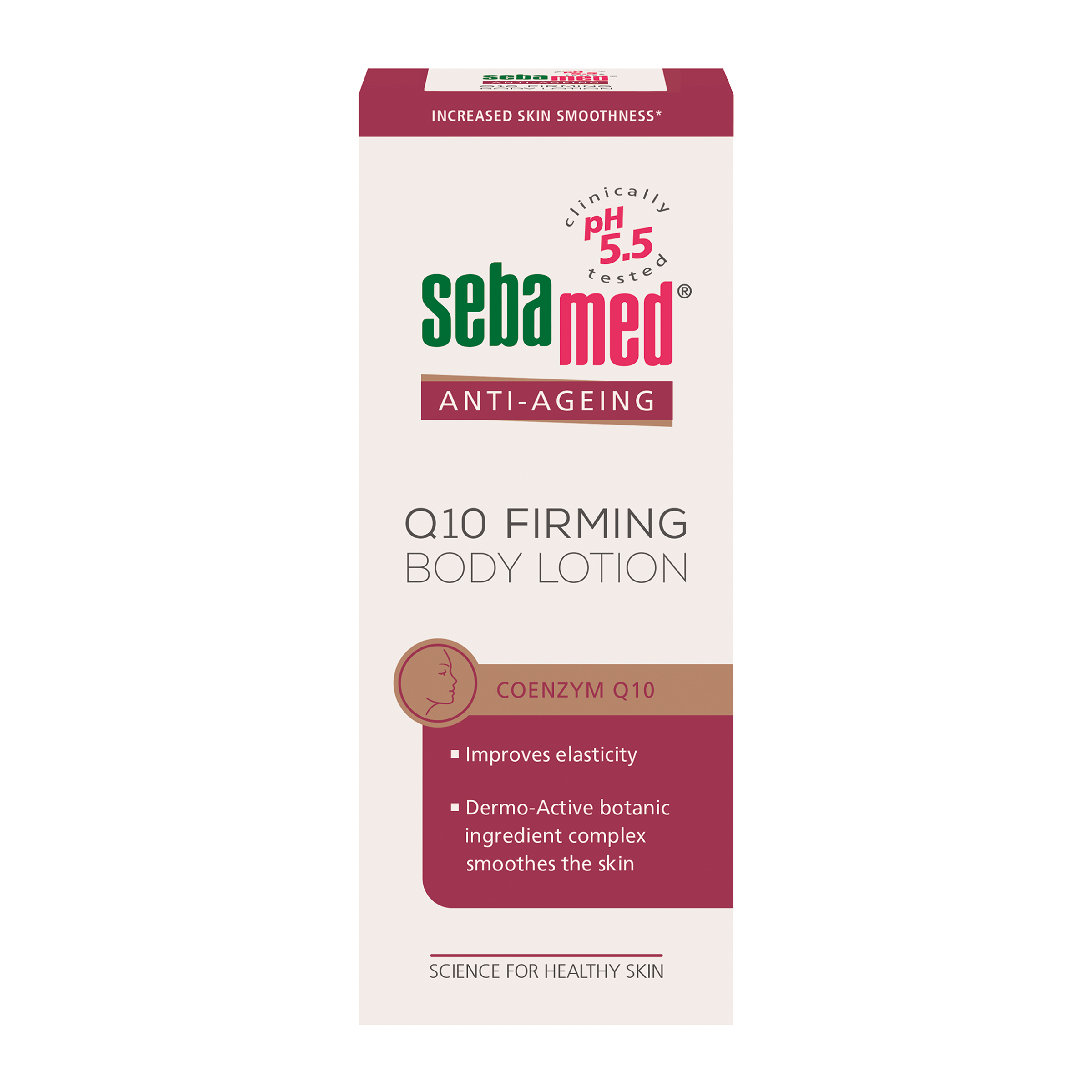 Anti-Ageing tělové mléko s Q10 působí proti stárnutí pokožky. Zvyšuje hydrataci, zlepšuje a obnovuje elasticitu a chrání kůži před příznaky stárnutí. Podporuje obnovu přirozeného ochranného pláště kůže s pH 5,5. Koenzym Q10 aktivuje metabolismus okysličování buněk. Komplex Dermo-Active (inovované rostlinné ingredience v kombinaci s arganovým olejem), výtažek z ječmene a bambucké máslo zvyšují a obnovují elasticitu kůže pro zachování její pevnosti. U 98 % uživatelů bylo prokázáno zpevnění pokožky po 3 týdnech používání. Tělové mléko je vhodné pro pokožku citlivou na vitamin A a produkty s AHA. Rychle se vstřebává bez pocitu mastnoty.
