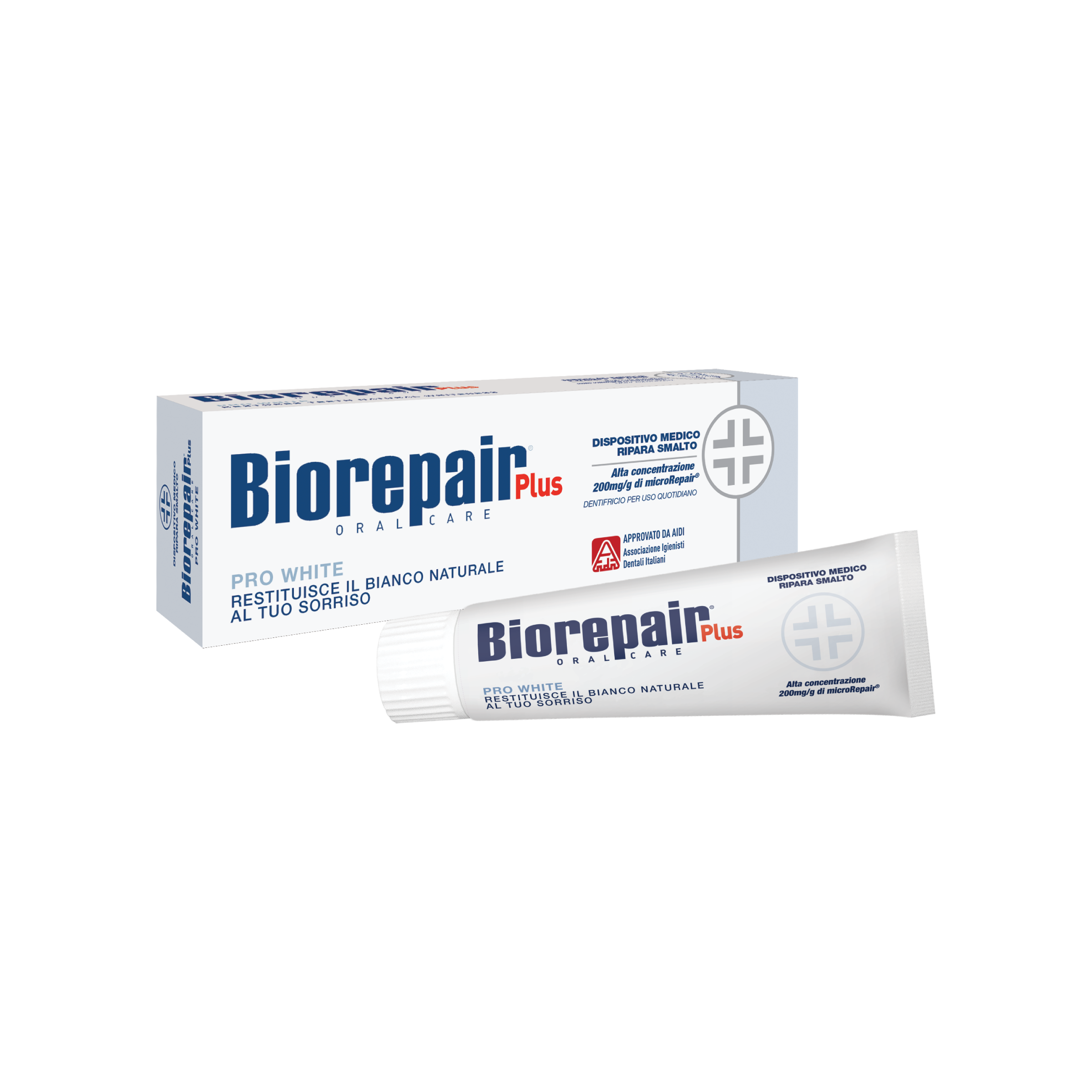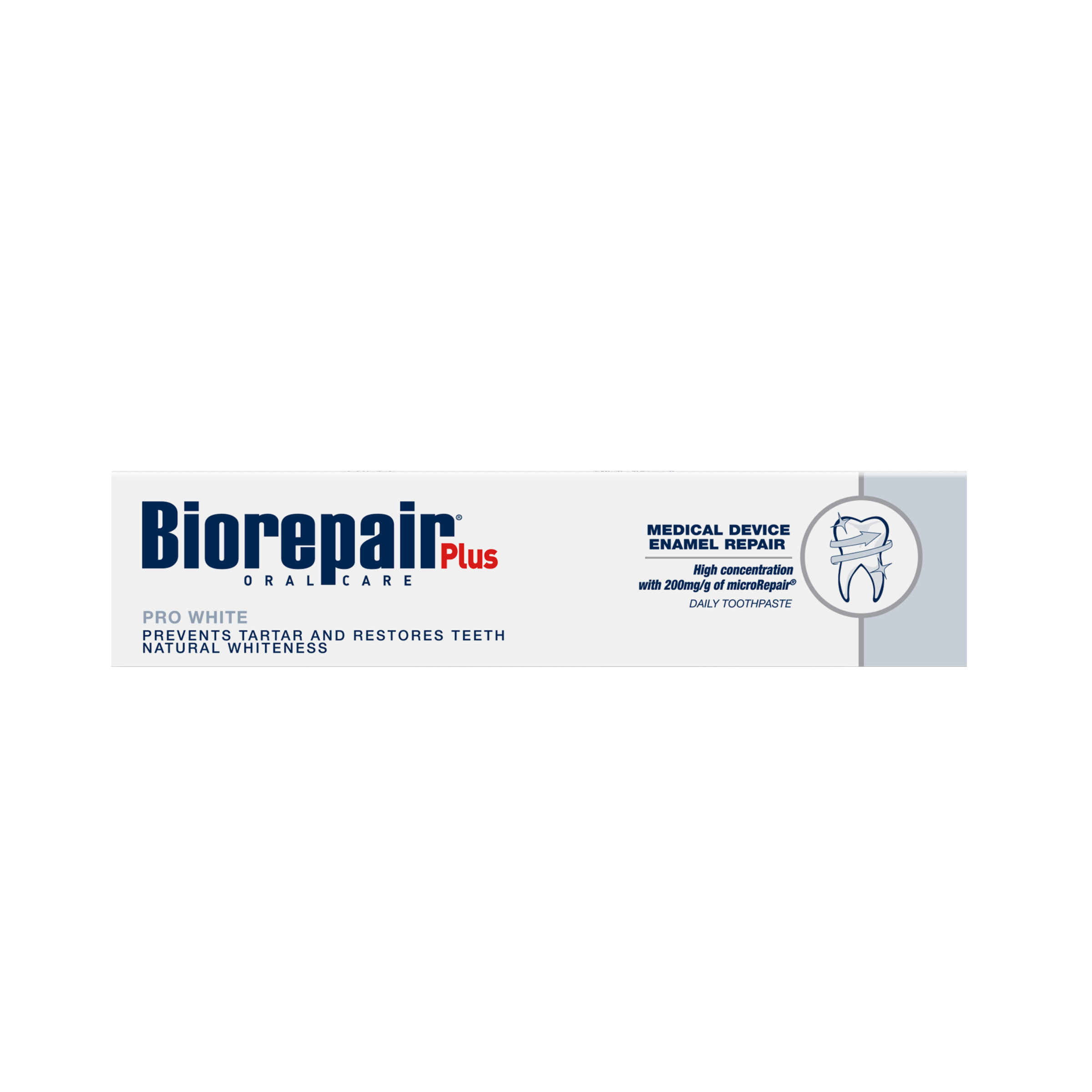 Zubní pasta Biorepair® Pro White Plus díky technologii microRepair® opravuje a chrání povrch skloviny. Obnovuje přirozený jas zubů. Kombinovaný účinek polymerů microRepair® a PVP umožňuje dvojitý účinek: terapeutický, který opravuje a remineralizuje zubní sklovinu a kosmetický bělící účinek, který odstraňuje stávající skvrny a zabraňuje tvorbě nových. Neobsahuje fluoridy.