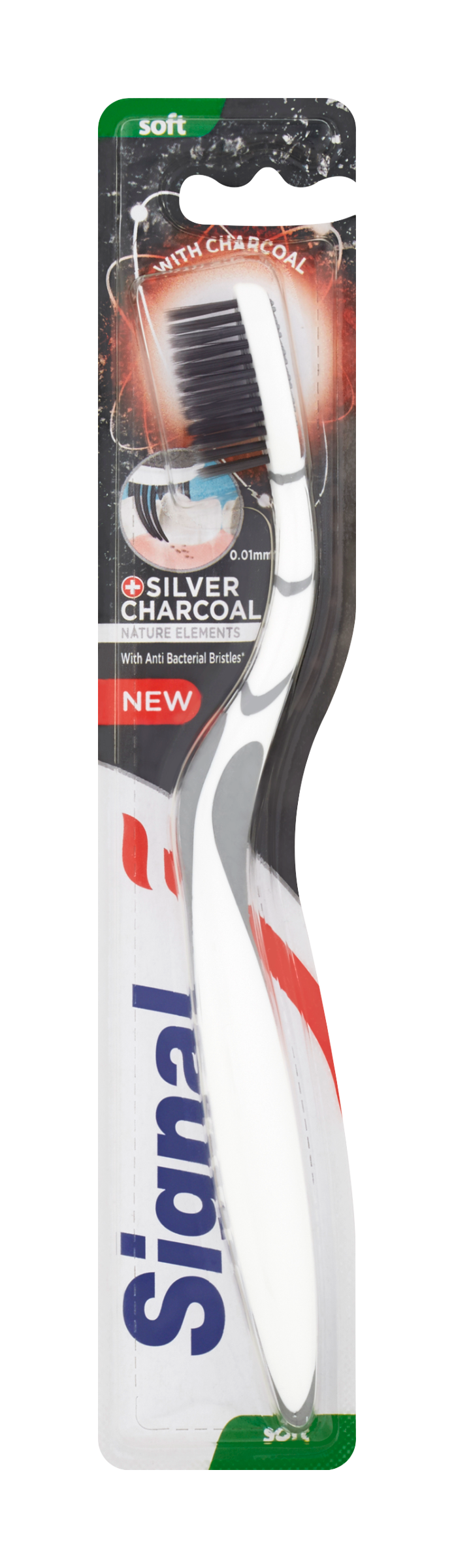 Jemný zubní kartáček Signal Sensisoft Charcoal má štětinky nasáklé přírodním aktivním uhlíkem a ionty stříbra, díky čemuž se na štětinkách nedrží bakterie až po dobu 3 měsíců. Zaoblený tvar rukojeti spolu s vhodně tvarovanou hlavicí Vám pomůže dosáhnout na všechny zuby, včetně zadních, čímž dokážete efektivně odstranit povlak a bakterie. Klinicky testováno. Pro Vaše čisté zuby bez povlaku.