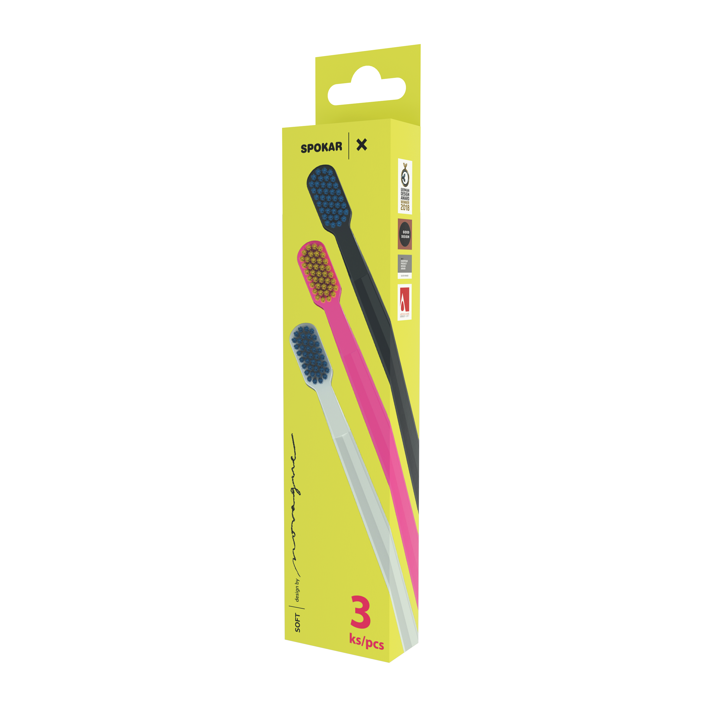 Oblíbený zubní kartáček SPOKAR X je nyní nabízen také v praktickém balení po třech kusech. Papírový obal spolehlivě zajistí ochranu kartáčků při skladování a poté ho lze snadno recyklovat.