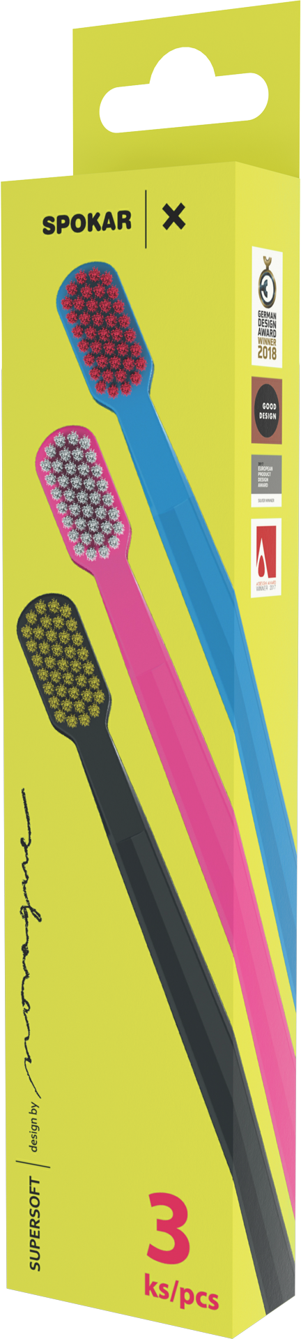 Kartáček SPOKAR X navrhl přední český designér Petr Novague na základě aktuálních doporučení stomatologických odborníků. Malá hlava je hustě osazena jemnými vlákny, která účinně odstraňují zubní plak a jsou šetrná k dásním. Držadlo s průřezem tvaru X pomáhá držet kartáček při čištění pod správným úhlem. SPOKAR X získal řadu prestižních mezinárodních ocenění včetně německé ceny German Design Award a amerického ocenění Good Design.
