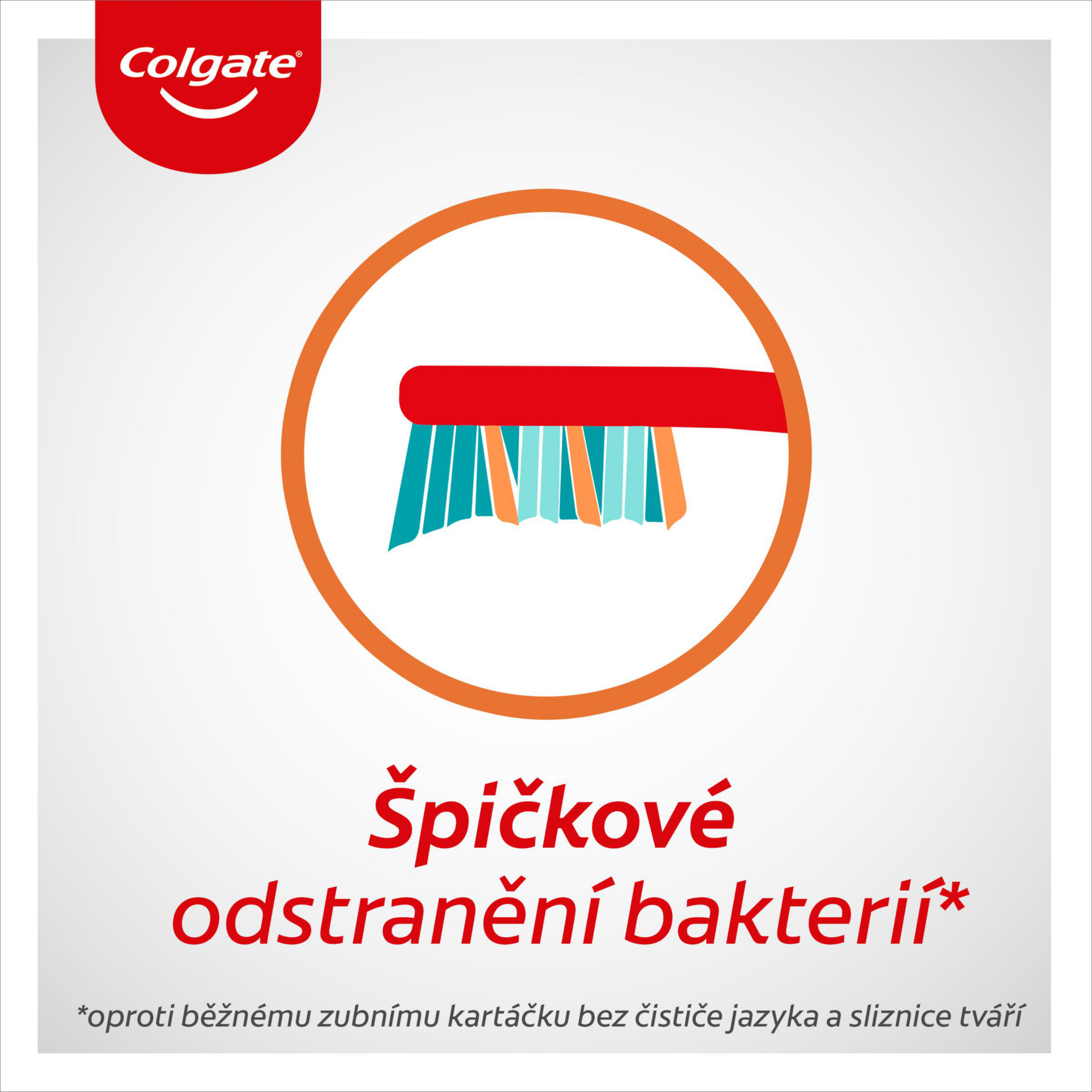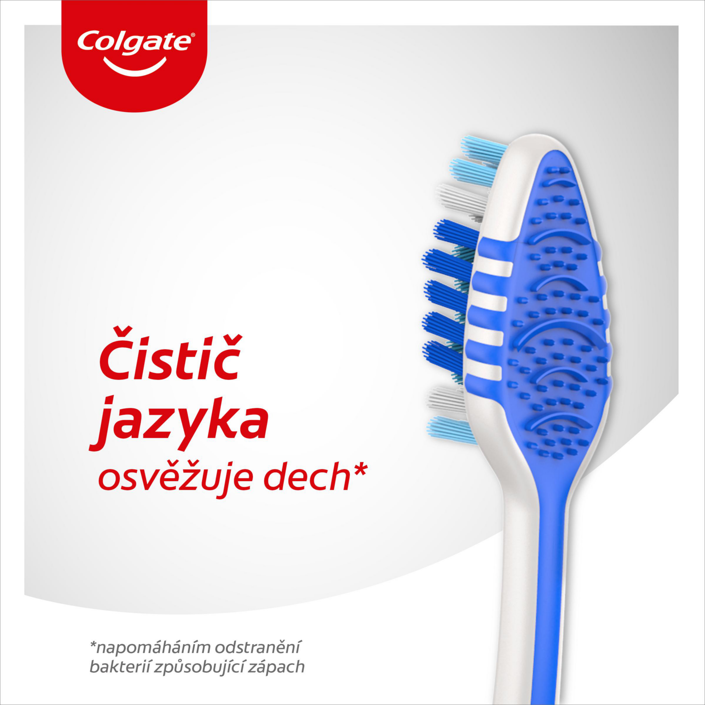 Pečujte o svá ústa a čistěte je do hloubky zubním kartáčkem Colgate Zig Zag. Tento ruční zubní kartáček má příčná vlákna, která jsou určena pro čištění mezi zuby pro dokonalé vyčistění. Zubní kartáček má také čistič jazyka, který jemně odstraňuje bakterie způsobující zápach pro celodenní sebevědomý úsměv. Navíc nabízí zubní kartáček lepší odstranění bakterií v porovnání s běžným kartáčkem bez čističe jazyka a sliznic tváří. Díky pružnému krku je jemný k dásním a je pohodlné ho používat. Díky čištění zubů, jazyka, sliznic tváří a dásní vám zubní kartáček Colgate Zig Zag poskytuje čistotu celých úst a můžete se tak usmívat po celý den.