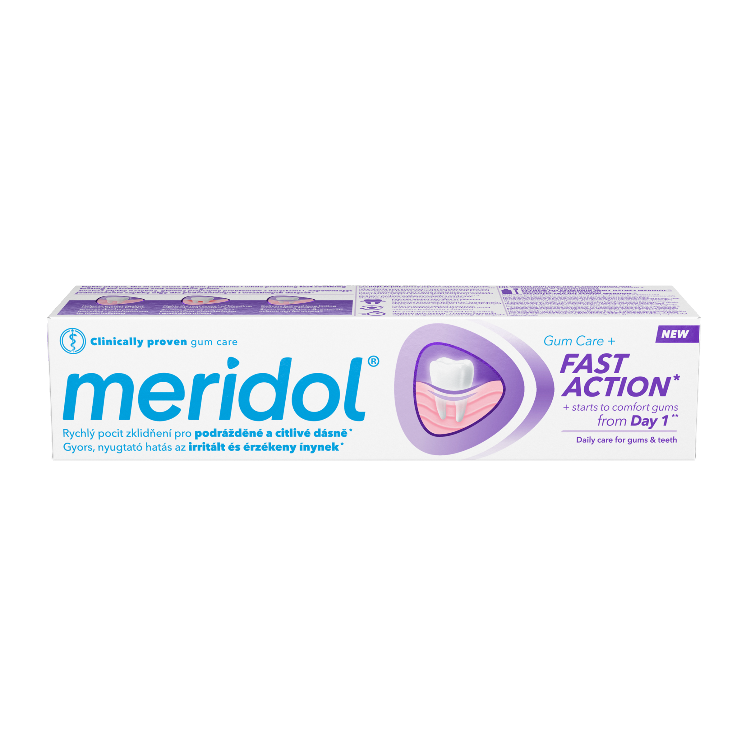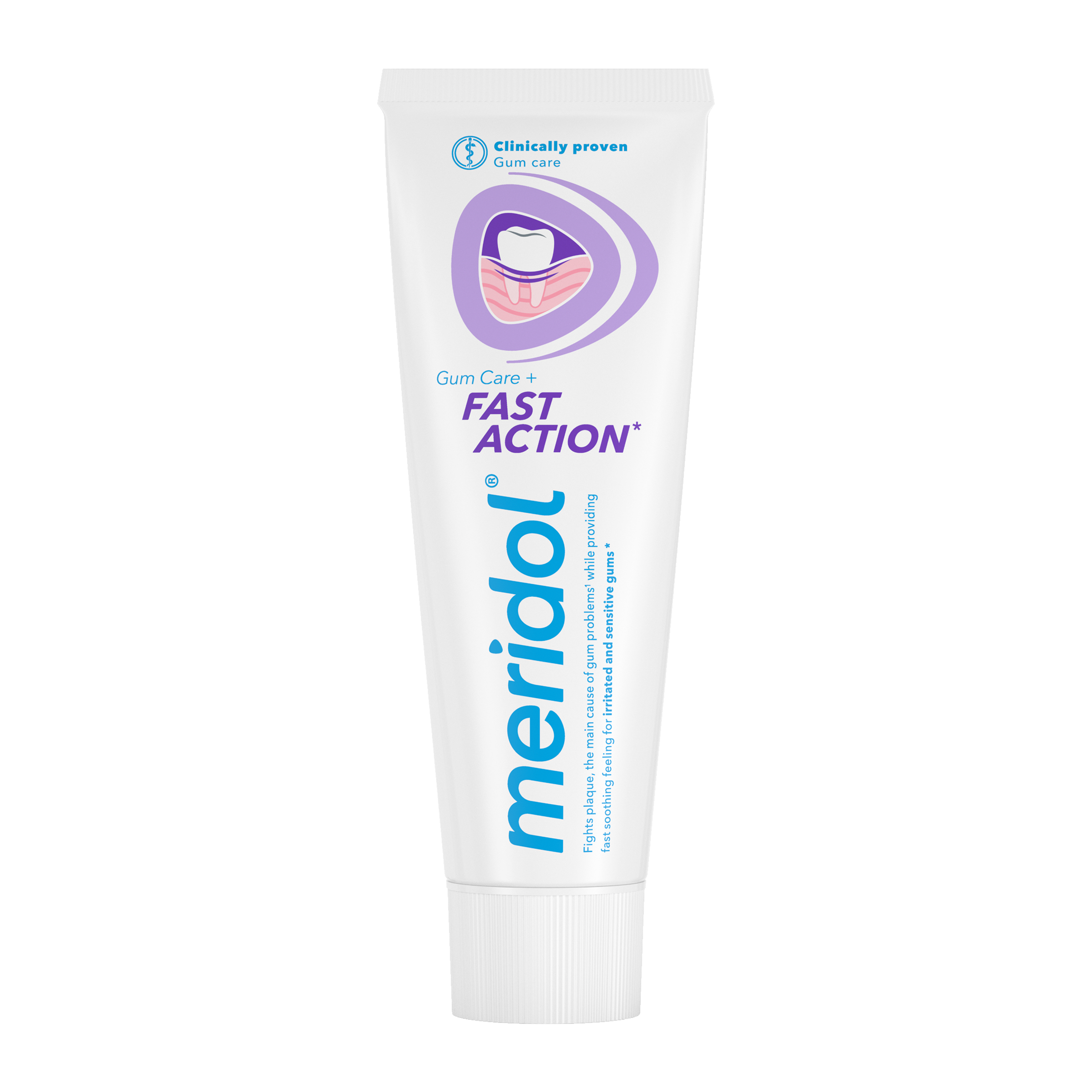 Zubní pasta meridol® Fast Action je speciálně vyvinuta pro péči o podrážděné a citlivé dásně. Pomáhá rychle zklidnit dásně a začíná působit již od prvního dne používání*. Klinicky ověřené složení bojuje proti bakteriím zubního plaku, které jsou hlavní příčinou problémů s dásněmi, jako je krvácení, zánět nebo citlivost. Díky dvojitě účinnému složení s cínem a fluoridem pomáhá chránit dásně před bakteriemi a zároveň poskytuje dlouhodobou antibakteriální ochranu. Složení obsahuje také eugenol, který přispívá k rychlému zklidnění dásní a pomáhá předcházet opakovanému výskytu potíží. Pasta zároveň pomáhá chránit před vznikem zubního kazu a omezuje hromadění zubního plaku.