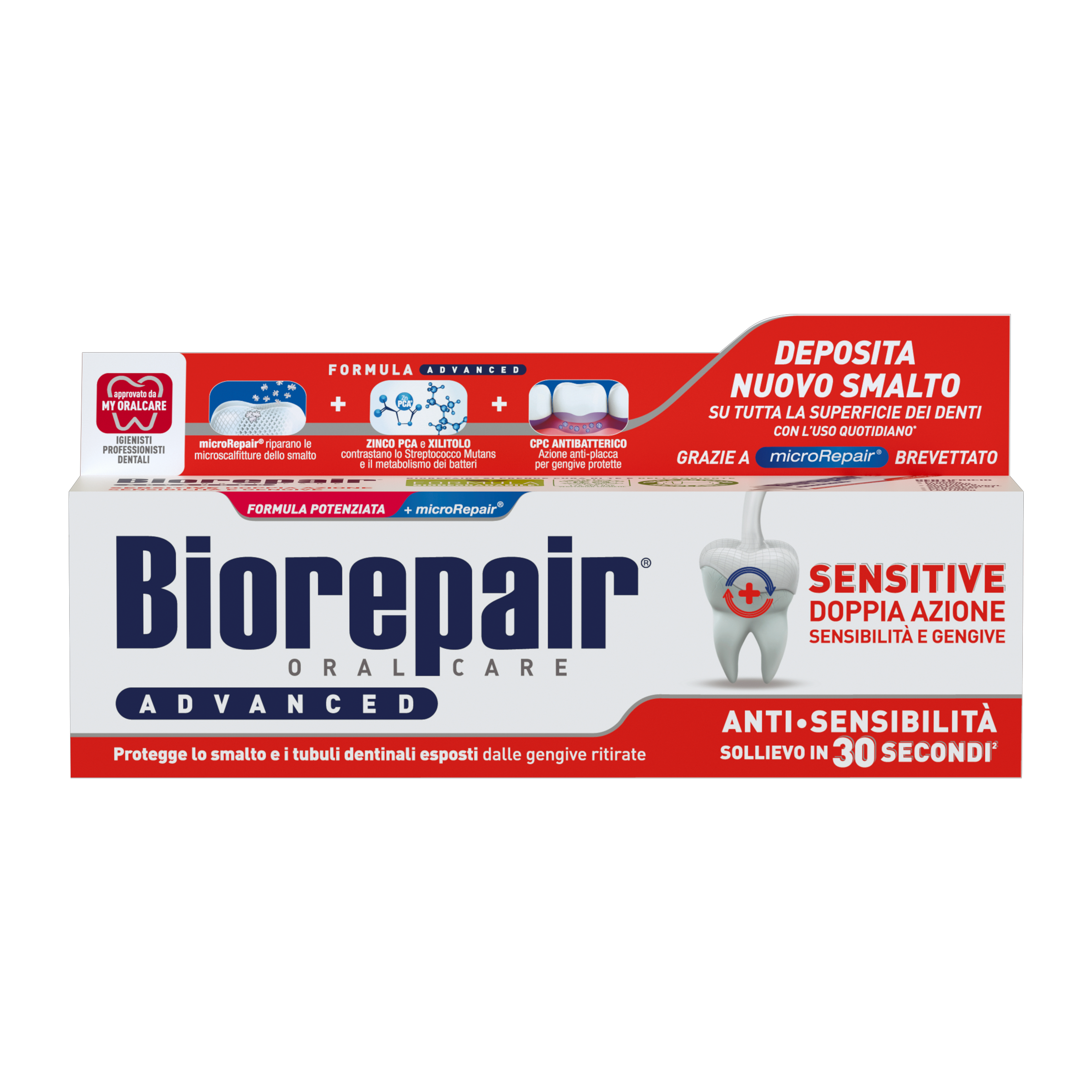 Zubní pasta pro citlivé zuby Biorepair s pokročilou recepturou chrání sklovinu a ustupující dásně před přecitlivělostí - úleva do 30ti sekund. Zubní pasta s obsahem microRepair®, biomimetických aktivních mikročástic hydroxyapatitu, které se svým složením podobají částicím obsaženým v zubní sklovině. Tyto částice jsou schopné proniknout mikrotrhlinami zubu, opravit poškozenou sklovinu a uzavřít odhalené dentinové kanálky. Současně pomáhá předcházet erozi a zabarvení zubní skloviny. Komplex s Xylitolem a Zinkem PCA zabraňuje působením kyselin a bakterií.
