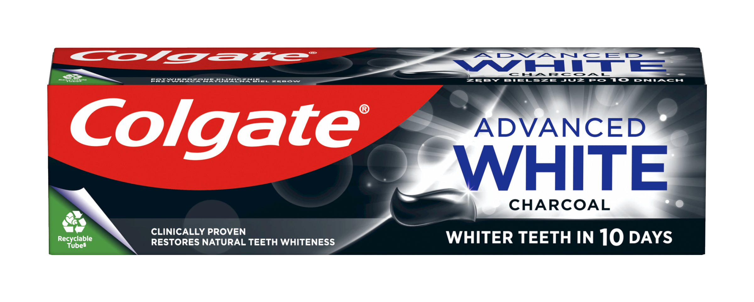 Za pouhých 10 dní můžete získat bělejší úsměv. A stačí si dvakrát denně čistit zuby s Colgate Advanced White Charcoal zubní pastou. Je klinicky prokázáno, že tato bělicí zubní pasta s aktivním uhlím účinně odstraňuje povrchové skvrny a obnovuje přirozenou bělost vašich zubů. Bělicí zubní pasta také zabraňuje ulpívání nových skvrn na zubech, takže zůstanou déle bělejší. A co víc, tato zubní pasta na bělení zubů osvěží váš dech, bojuje proti zubnímu kazu, pomáhá odstraňovat plak při pravidelném čištění zubů a je také bezpečná pro každodenní použití.