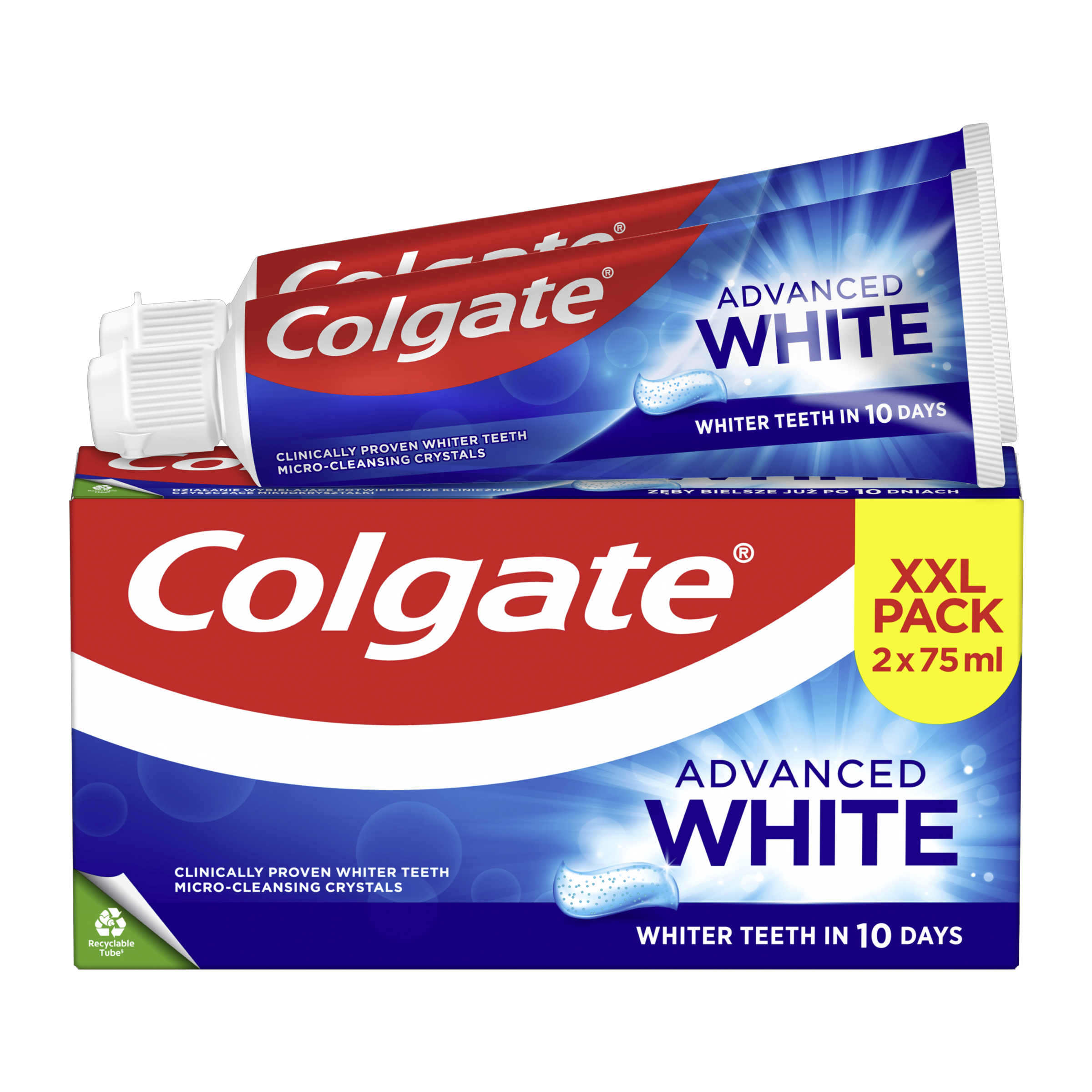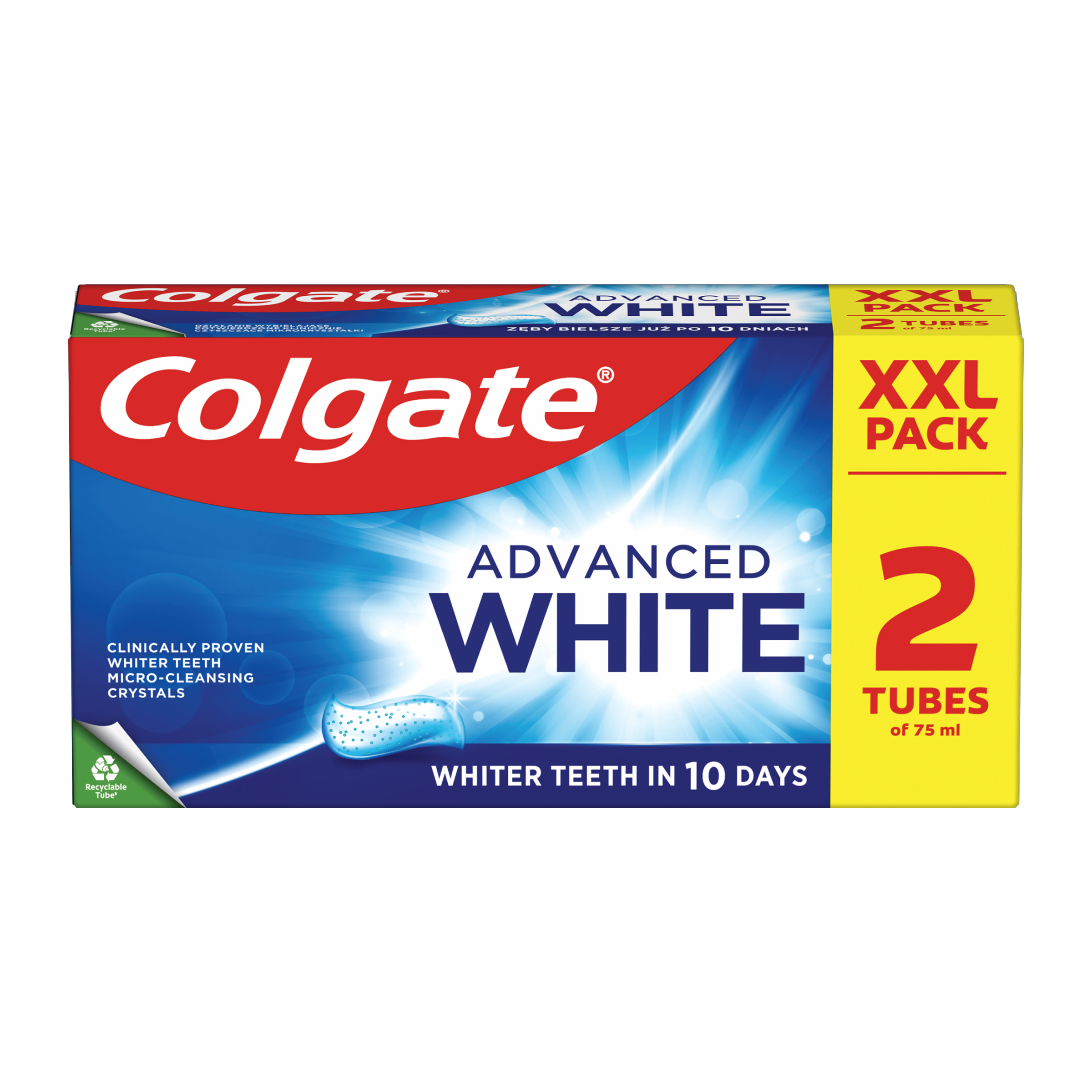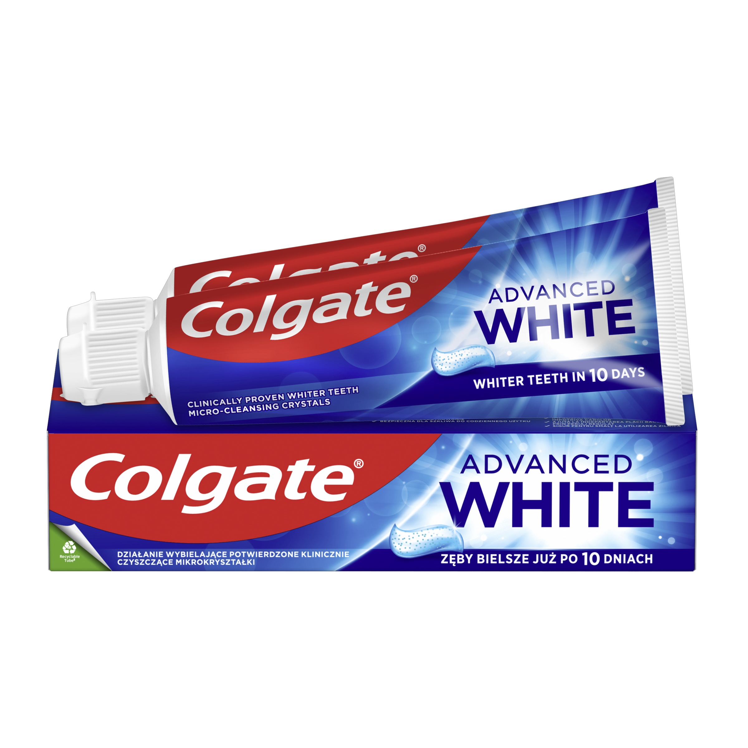 Vyzkoušejte zubní pastu Colgate Advanced White pro bělejší zuby již za 7 dní! Tato bělící zubní pasta s mikroleštícími krystalky jemně leští a je klinicky prokázáno, že účinně bělí.