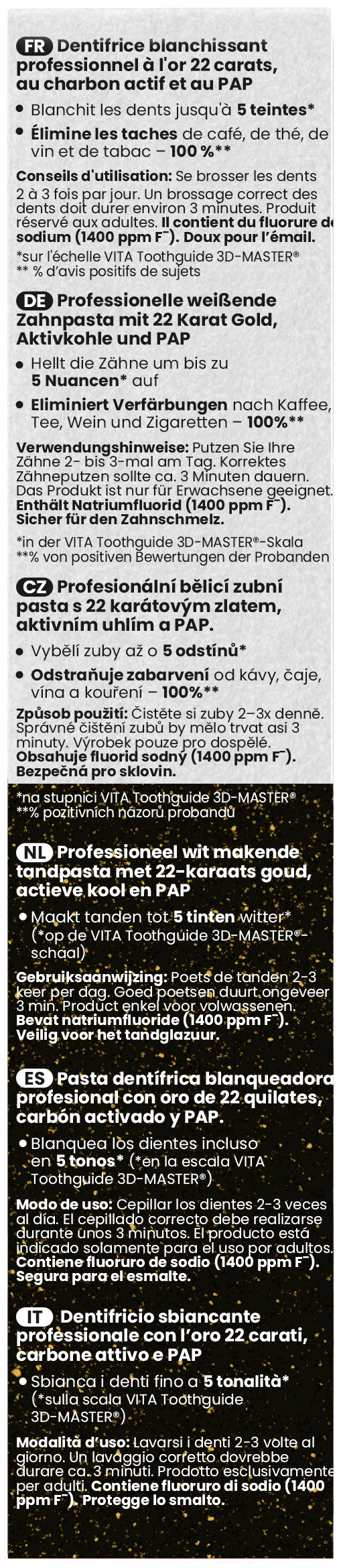 - 22 karátové koloidní zlato s aktivním uhlím a inovativní PAP (kyselina ftalimido-peroxy-kapronová): bělí zuby o 1 odstín*