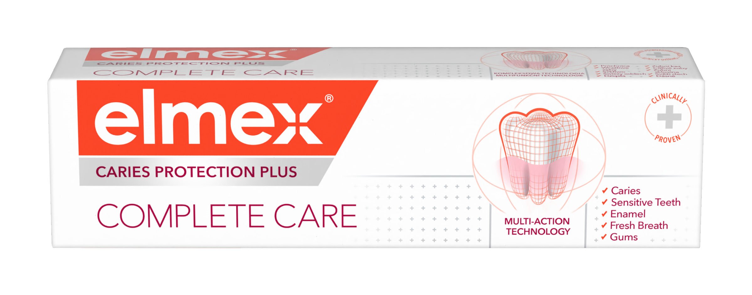 Pečujte efektivně o svá ústa pomocí zubní pasty elmex® Caries Protection Plus Complete Care, která pomáhá předcházet řadě problémů dutiny ústní. elmex® Caries Protection Plus Complete Care obsahuje klinicky ověřenou technologii fluoridu cínatého a fosforečnanu zinečnatého s vysokou účinností v ochraně proti zubnímu kazu při použití dvakrát denně. Zubní pasta při každodenním použití také pomáhá remineralizovat sklovinu a pomáhá chránit před zubním kazem, oslabením zubní skloviny, zubním kamenem , citlivostí zubů a podrážděním dásní. Pomáhá rovněž obnovovat přirozenou bělost vašich zubů. Pečujte o své zuby a ústa pomocí zubní pasty elmex® Caries Protection Plus Complete Care.