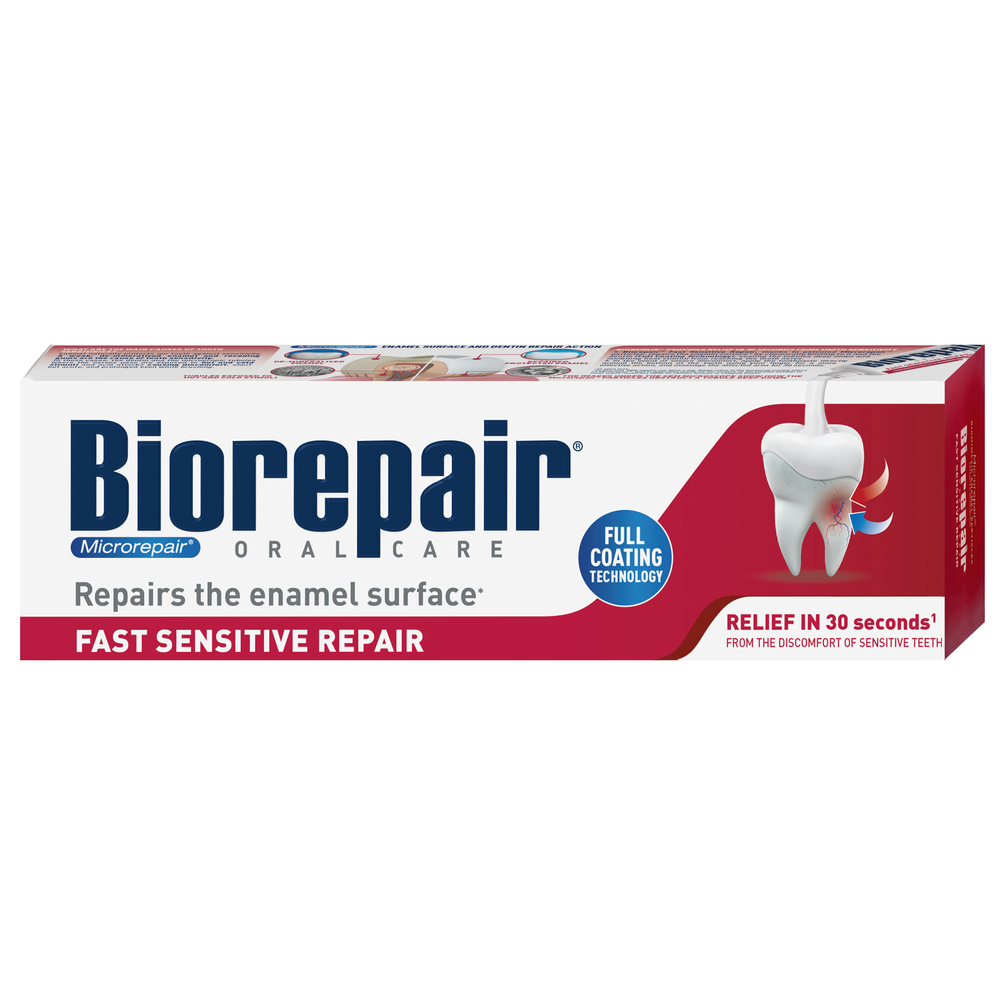 Biorepair Fast Sensitive Repair International zubní pasta bez fluoridu ochrání vaše zuby a díky ní si budete si moct užívat teplé i studené nápoje bez nepříjemné bolesti. Proniká do poškozených zubů a díky technologii MicroRepair je pomáhá zacelovat. Přispívá ke snížení citlivosti zubů na teplé a studené podněty. Pastu lze používat každodenně pro předcházení problémů s citlivými zuby.