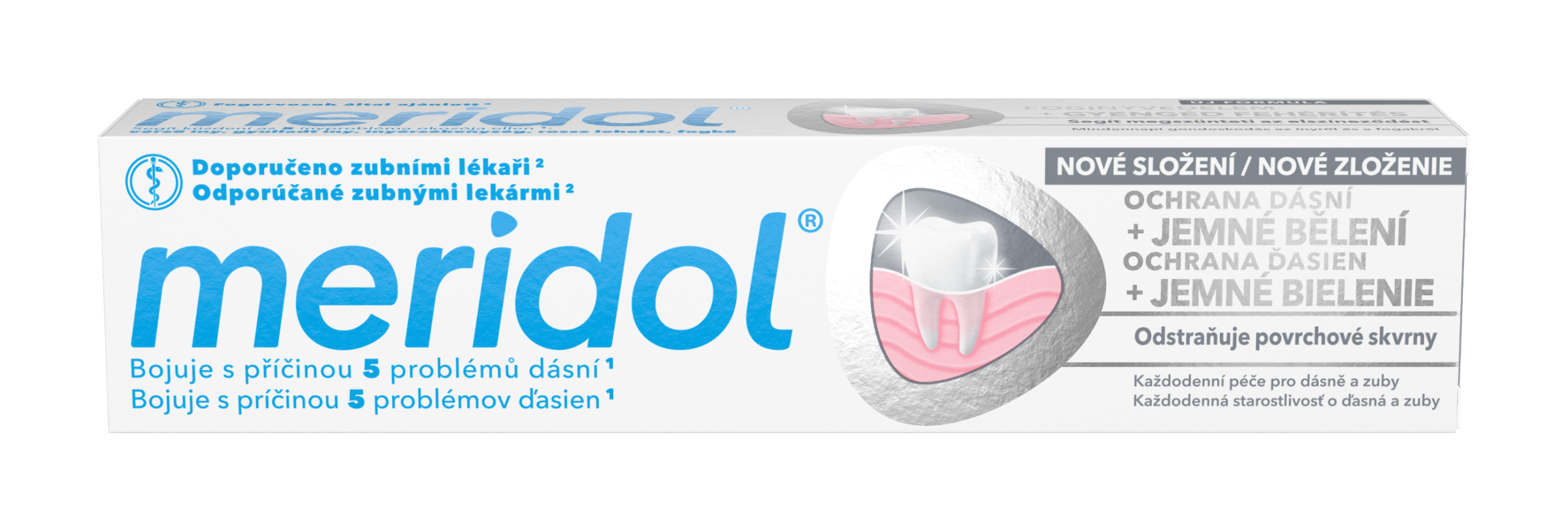 Zubní pasta meridol® Ochrana dásní + jemné bělení pomáhá bojovat s příčinou 5 problémů dásní: krvácení, zánět, citlivost, zápach z úst a zubní kámen.* *Redukce plaku při pravidelném používání dříve, než se problémy objeví.