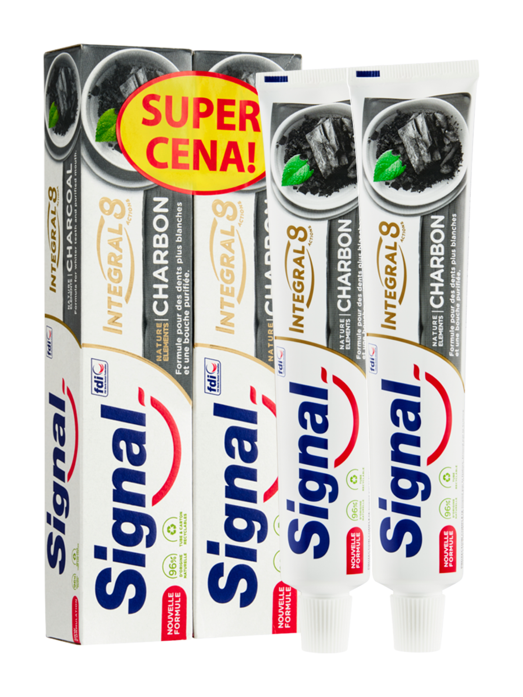 Ještě více přírodních ingrediencí. Plně recyklovatelné balení. Nyní dvě pasty za výhodnější cenu. Všechny zubní pasty z řady Signal Nature Elements nyní obsahují 96% ingrediencí přírodního původu. Naše šetrné složení kombinuje přírodní oleje a zinek, poskytuje kompletní ochranu proti zubnímu kazu. Varianta Charcoal je obohacena práškem z aktivního uhlí, známé pro své čistící a detoxikační vlastnosti. Napomáhá odstraňovat skvrny způsobené jídlem a navrací přirozenou bělost zubů.