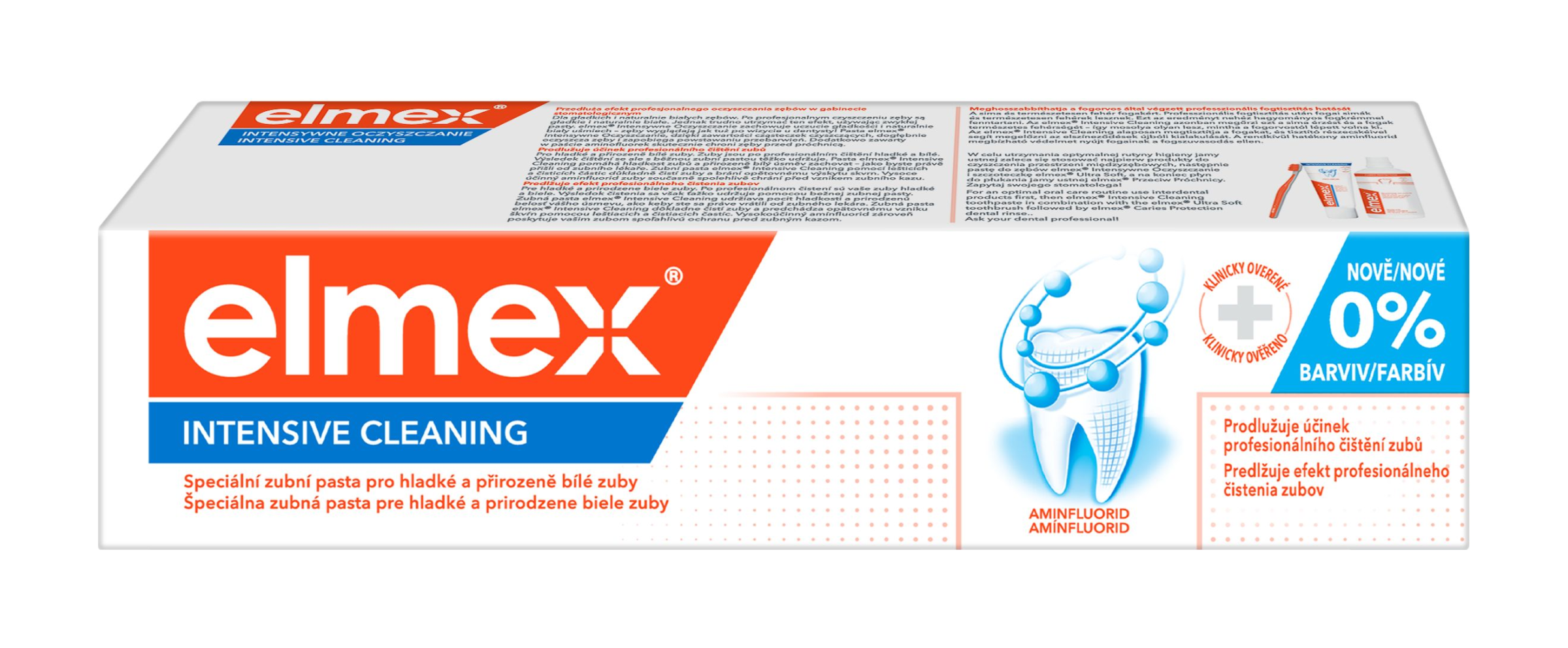 Se zubní pastou elmex® Intensive Cleaning můžete udržet své zuby hladké a přirozeně bílé po dobu až 12 týdnů* po profesionálním čištění v zubní ordinaci. Zubní pasta vám poskytne kompletní čištění, obsahuje leštící částice, které zabraňují tvorbě skvrn, a aminfluorid pro ochranu před zubním kazem. *Klinická studie