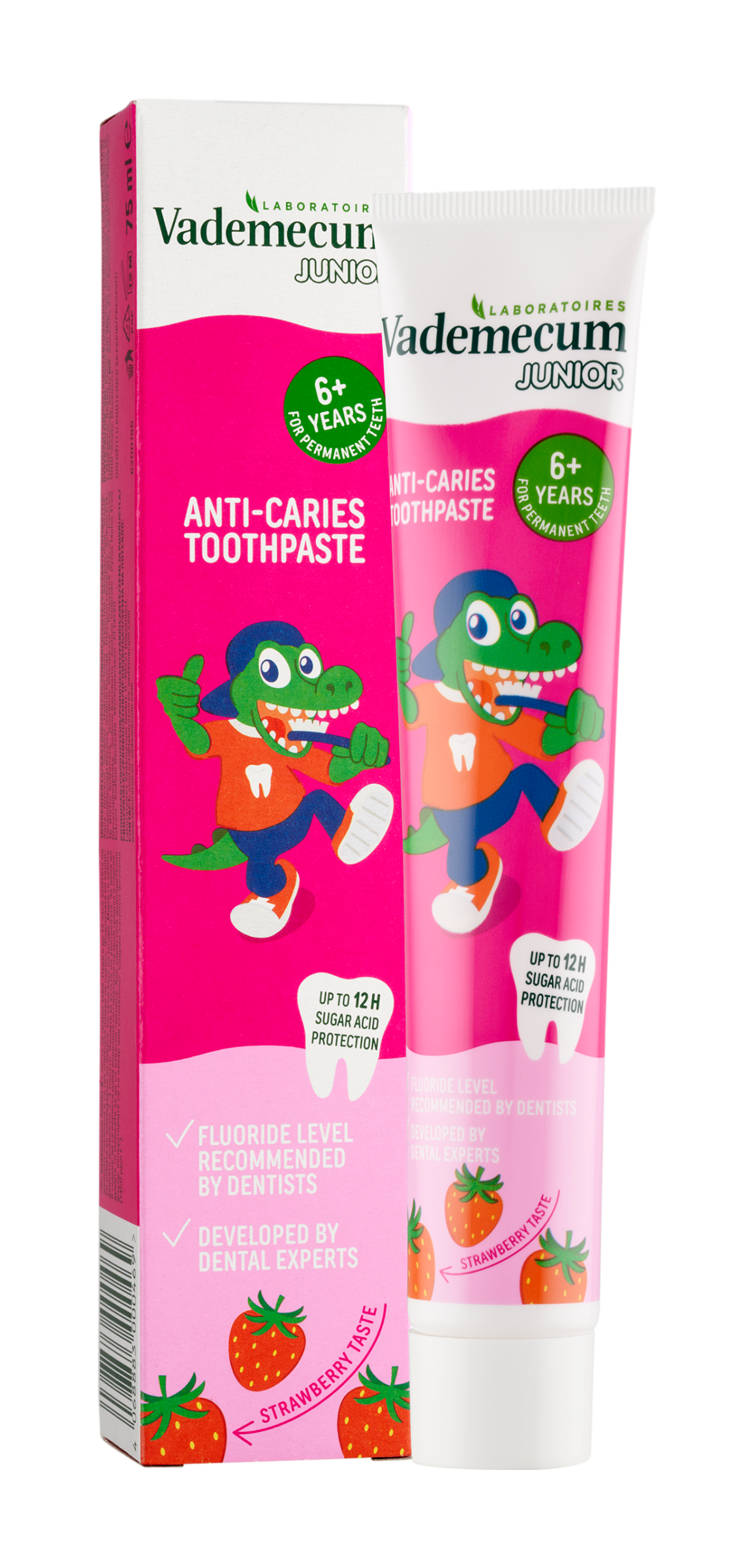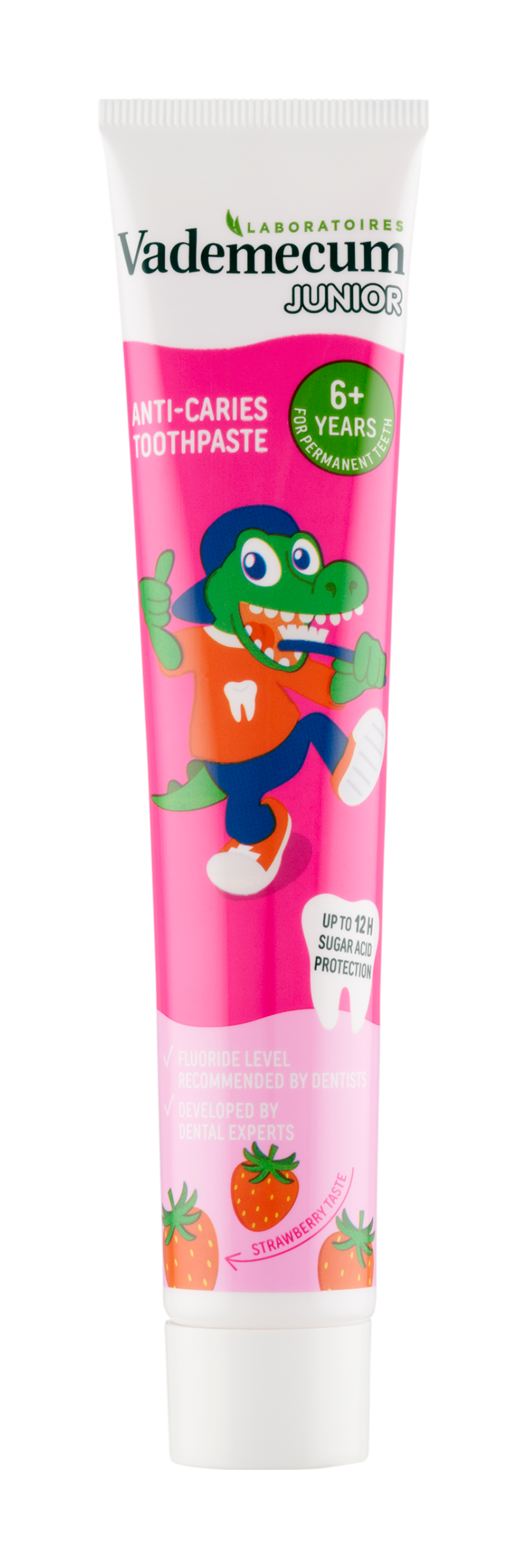 Zubní pasty Vademecum Junior s jahodovým či svěžím mátovým aroma jsou dokonalou zubní péčí dětem od 6 let. Poskytují až 12 h ochranu proti cukerným kyselinám a brání vzniku zubního kazu. Zubní pasty řady Junior jsou vhodné k ochraně prvních zubů před kazem a obsahují doporučenou hladinu fluoridu sodného 1450 ppmF-*.