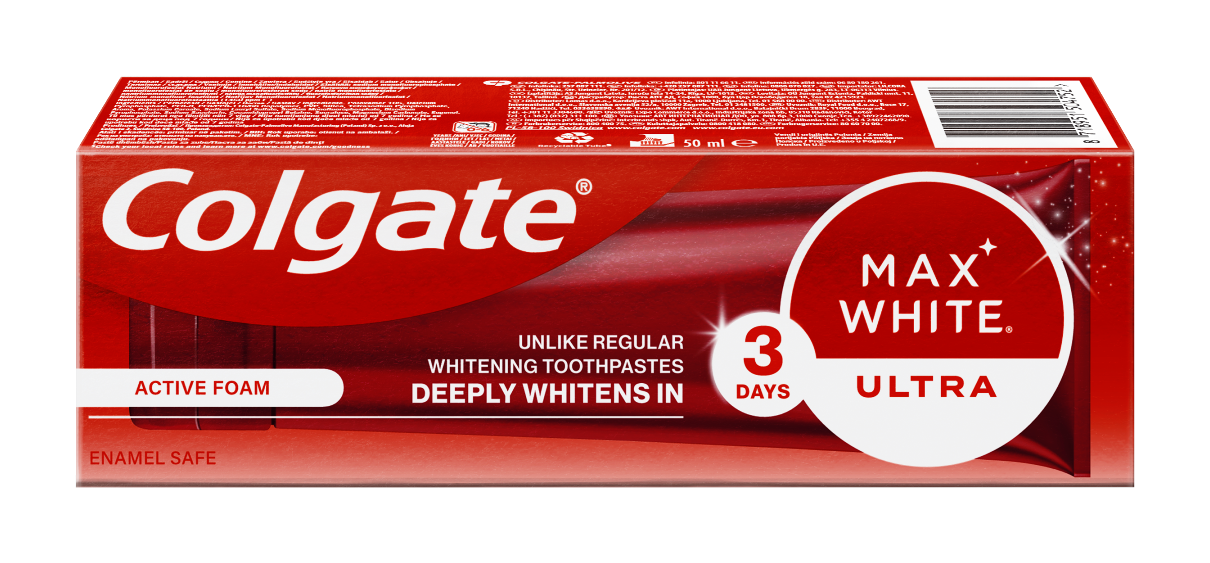 Zubní pasta Colgate Max White Ultra Active Foam s revoluční hloubkovou kyslíkovou reakcí zajistí klinicky prokazatelně bělejší zuby za 3 dny*! *Zabarvení způsobené jídlem a nápoji.