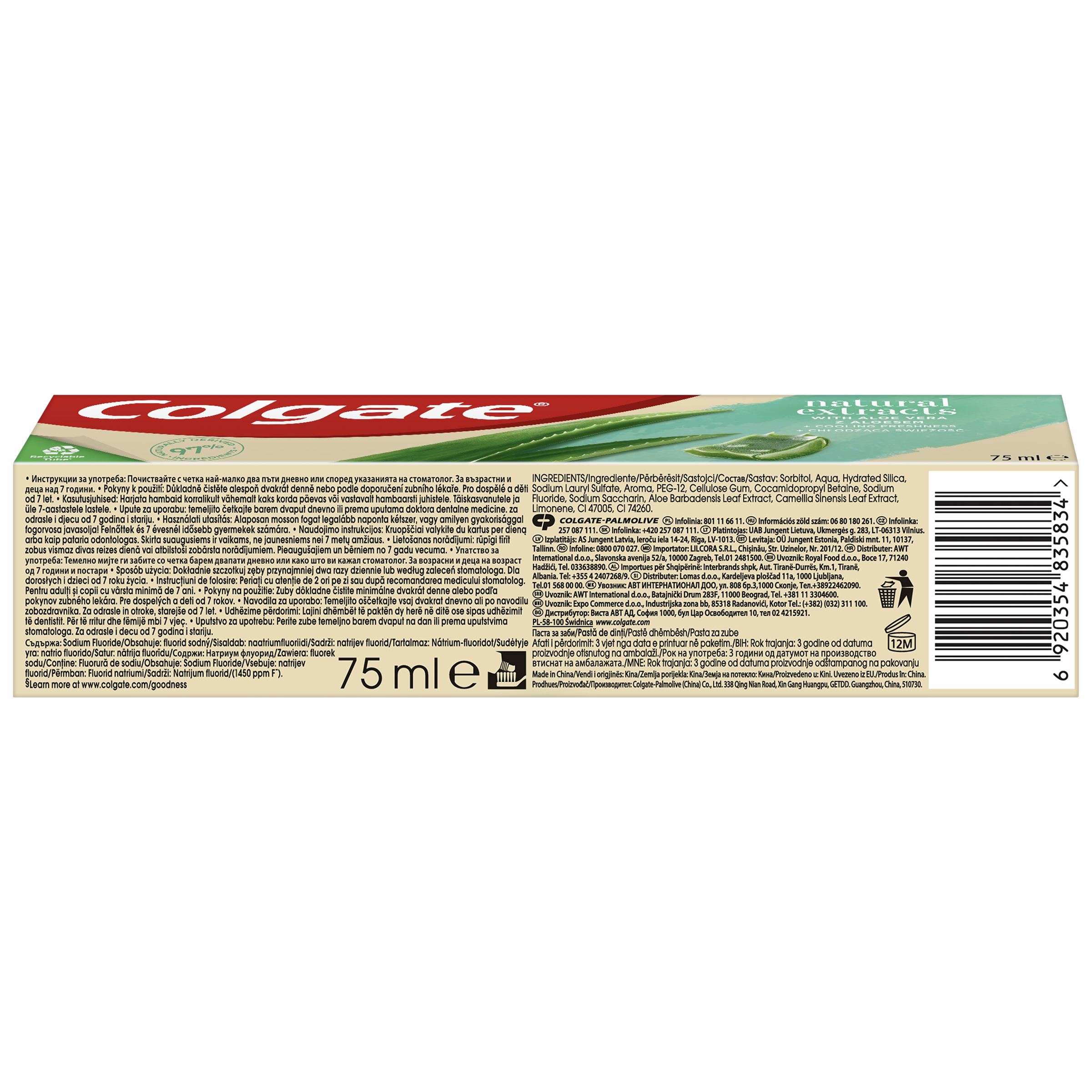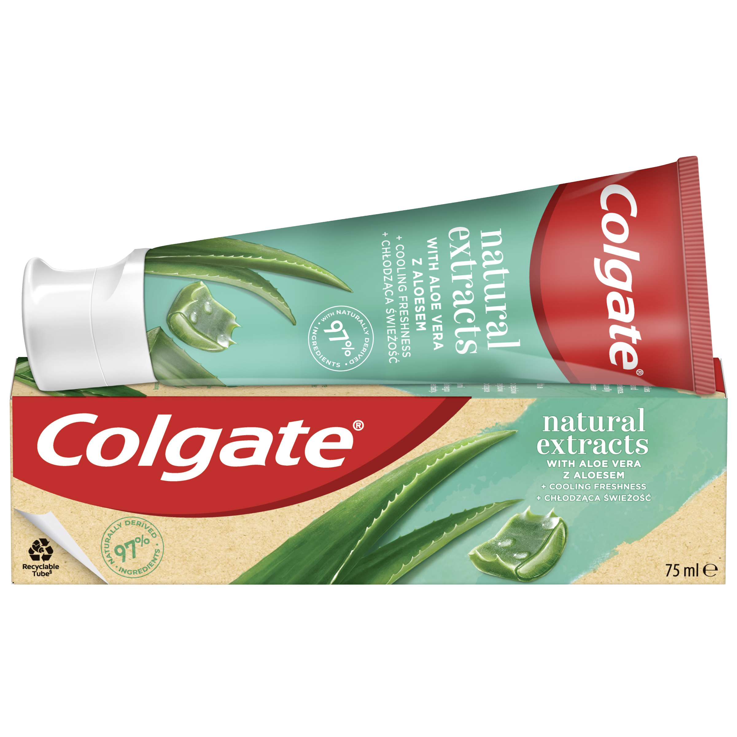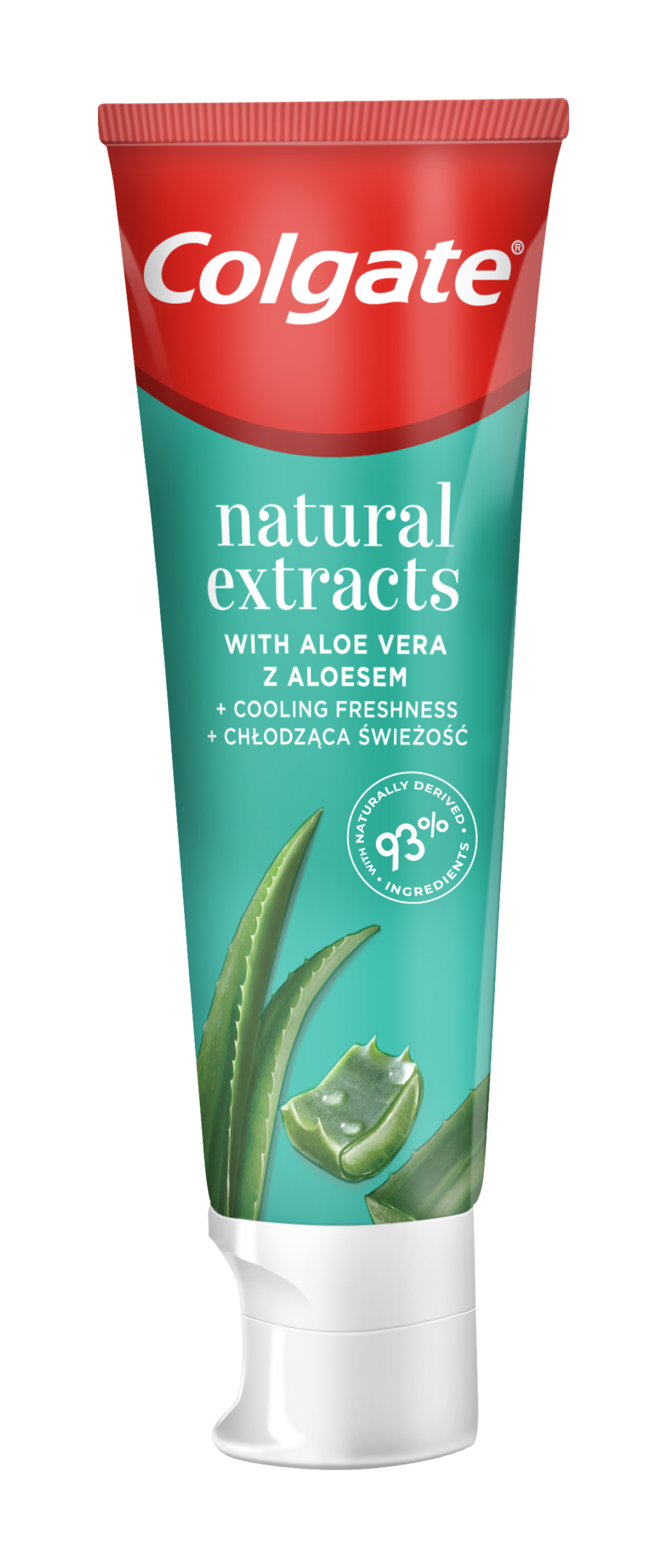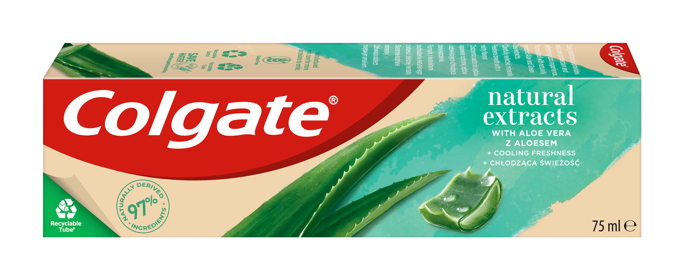 Pociťte příval osvěžení se zubní pastou Colgate Natural Extracts Aloe Vera navrženou speciálně tak, abyste se při každém čištění zubů usmívali ještě více. Osvěžující složení zubní pasty s přírodně získanými výtažky z Aloe Vera bylo vytvořeno pro krásný úsměv a každodenní péči. Díky osvěžující mátové příchuti a výtažkům z Aloe bude každé čištění zubů ještě příjemnější. Zubní pasta poskytuje ochranu zubů a osvěžující, chladivý zážitek při každém ranním a večerním čištění. Pečlivě vybrané minerály a 97 % přírodně získaných složek ve složení vám umožní užívat si svěží dech a pečovat o zdravé zuby.