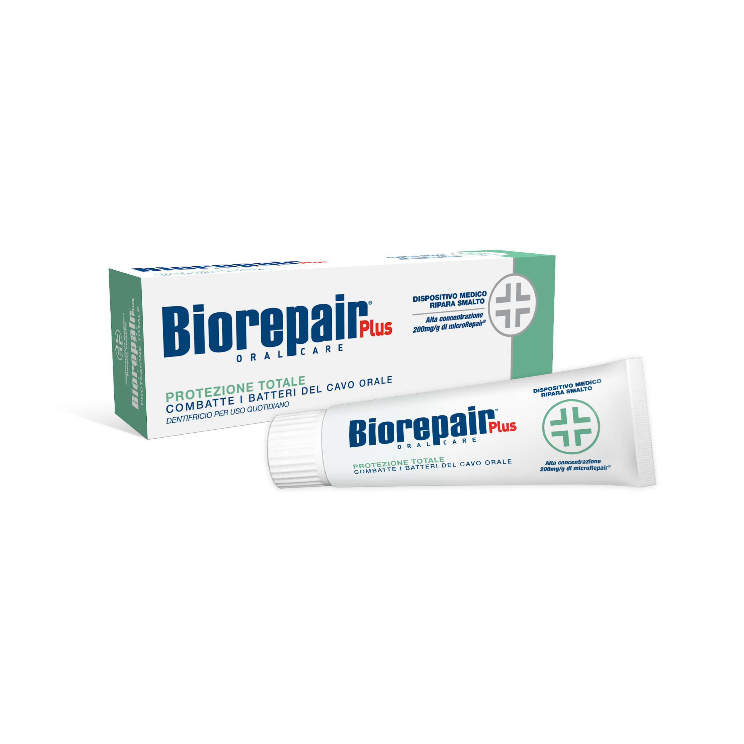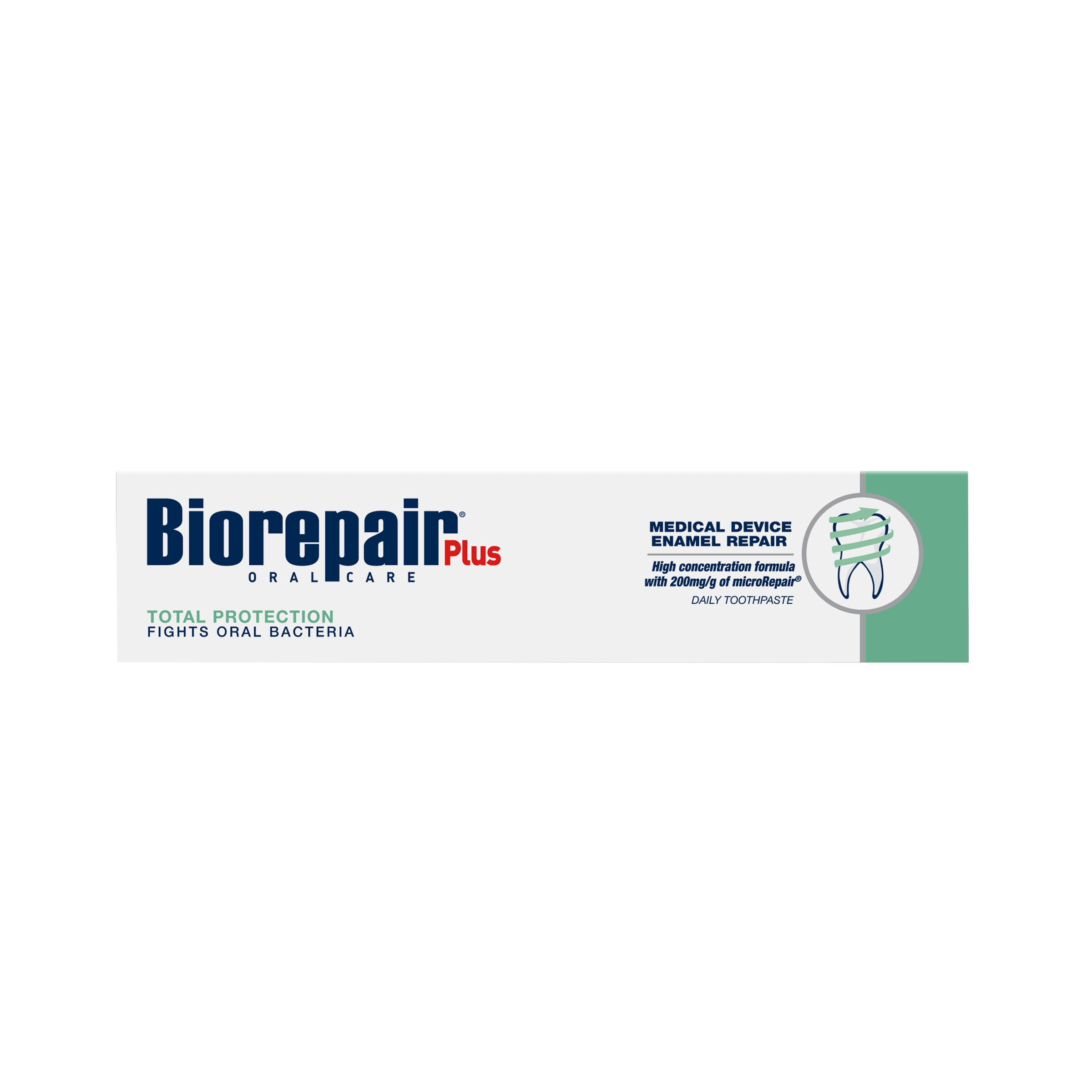 Biorepair® Plus Total Protection cestovní balení je zubní pasta s mikročásticemi microRepair®, které jsou podobné složení nacházejícím se v našich zubech. Tyto mikročástice jsou schopny proniknout do mikroškrábanců na zubech, opravit poškozenou sklovinu a uzavřít obnažené dentinové kanálky. Jeho složení je obohaceno o zinek PCA, který pomáhá bojovat proti růstu bakterií, které mají za následek vznik plaku, zubního kamene a kazů. Vhodné pro uživatele trpící na halitózu (nepříjemný zápach z úst). Neobsahuje fluorid, oxid titaničitý, SLS, parabeny ani křemičitá brusiva.