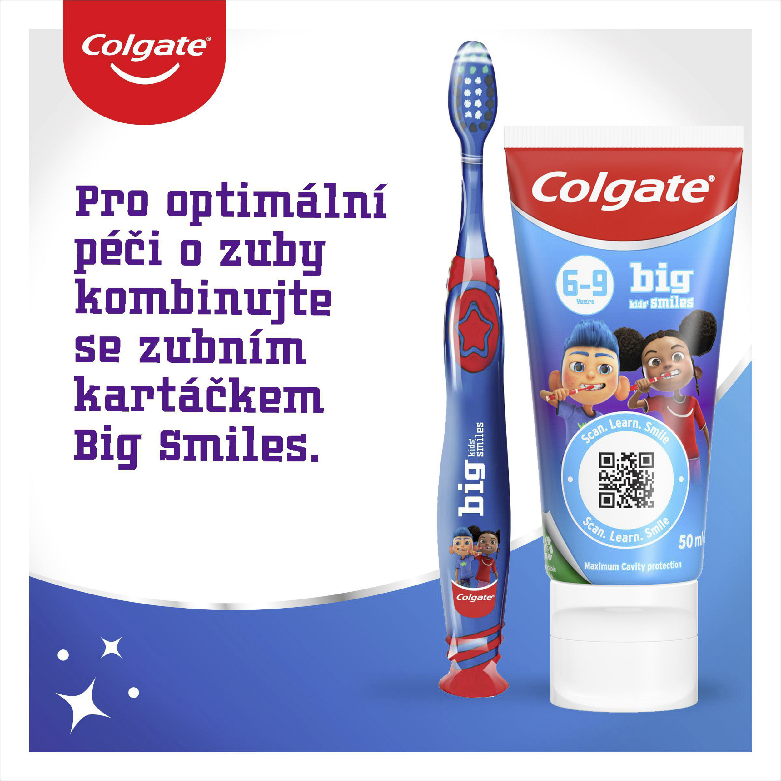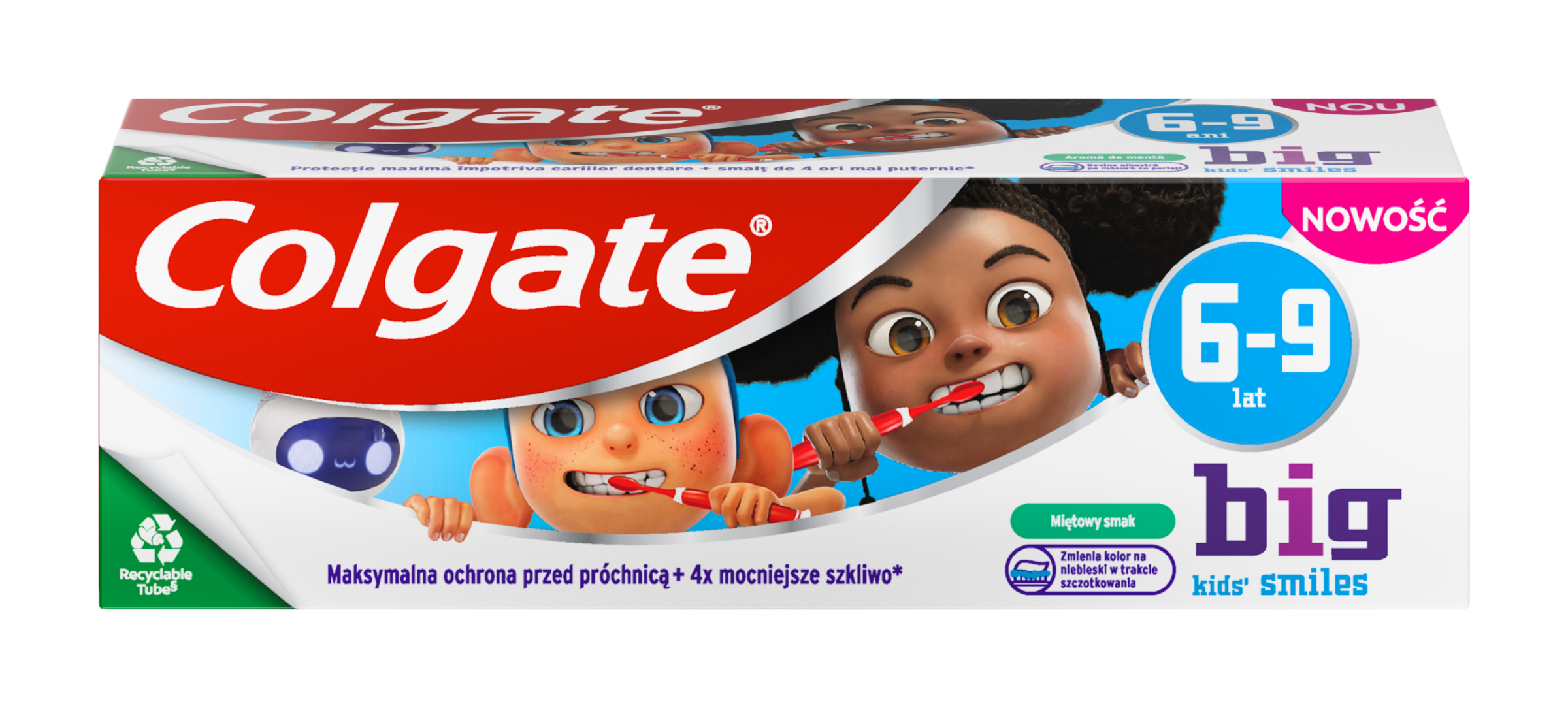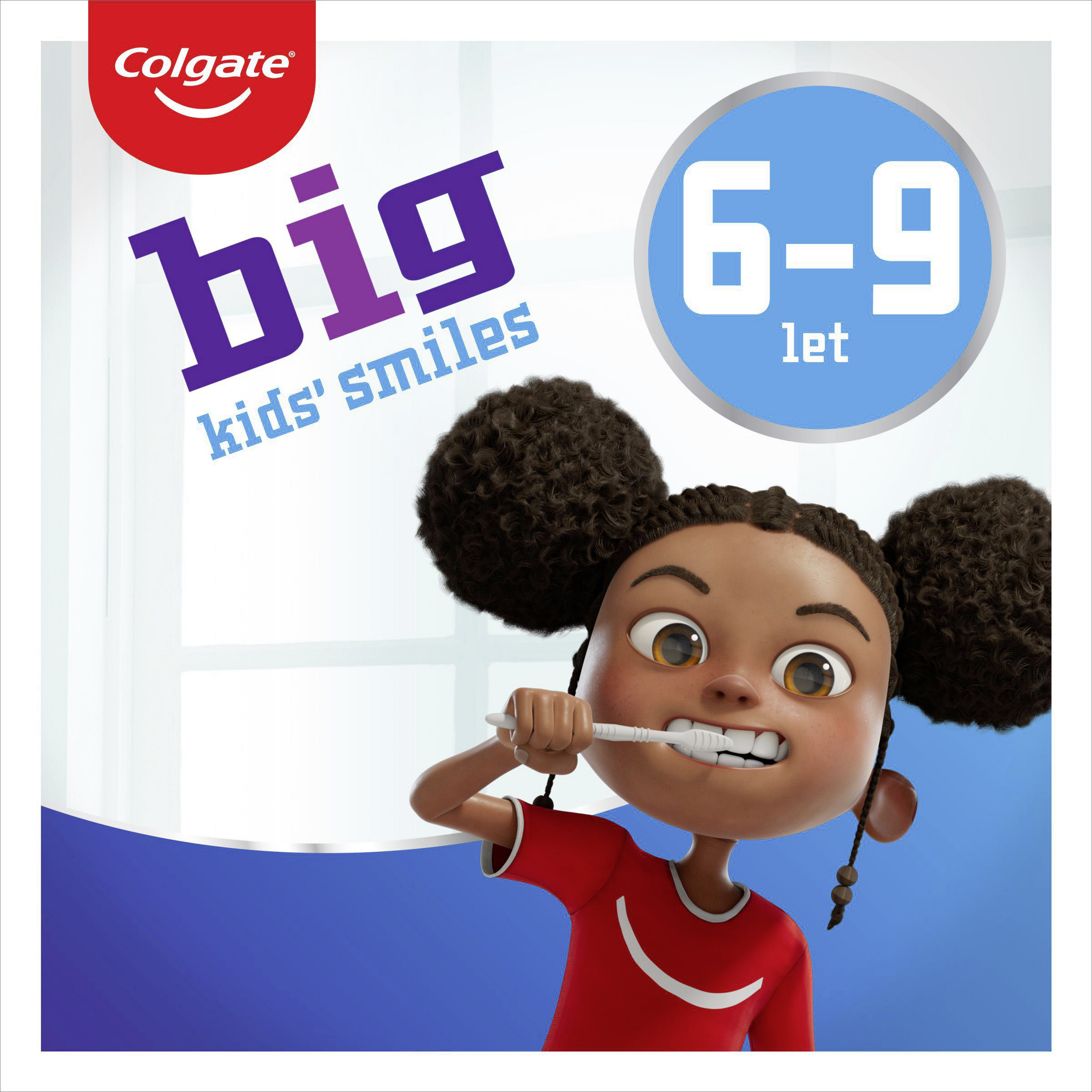 Zubní pasta Colgate Big Kids' Smiles pro děti od 6 do 9 let poskytuje maximální ochranu před zubním kazem a 4× posiluje zubní sklovinu*. *Po 2 týdnech změna mineralizace v porovnání s běžnou fluoridovou zubní pastou.