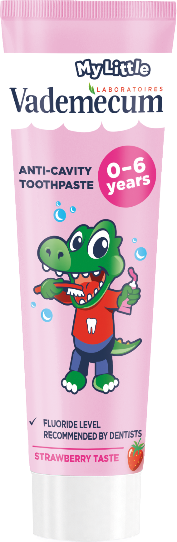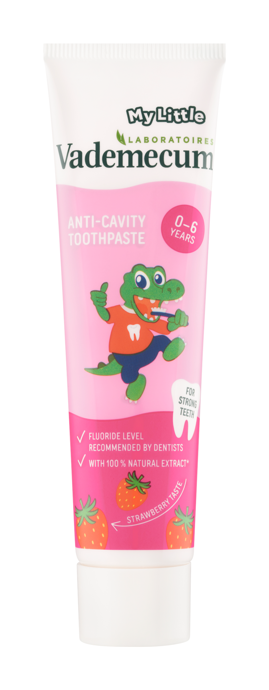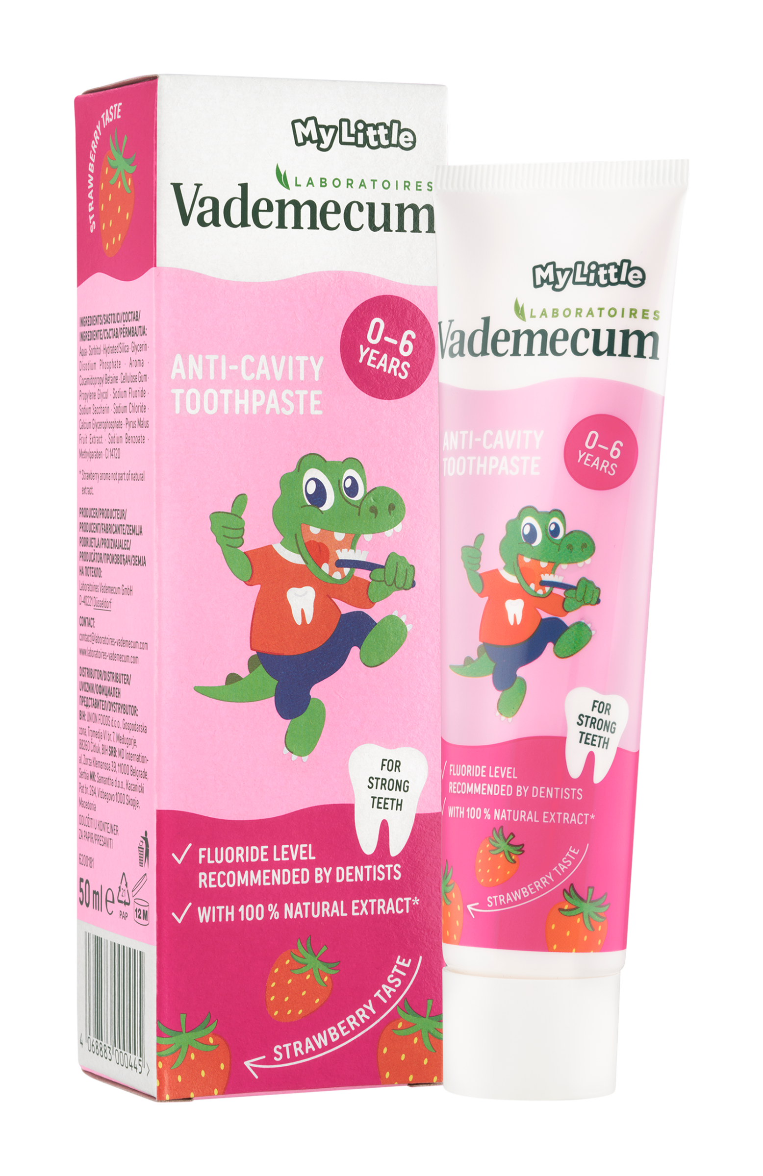 Zubní pasty My Little Vademecum s jemnou jahodovou či jablečnou příchutí jsou určené pro děti do 6 let. Dobrá péče o zuby začíná již začátkem zdravé péče o mléčný chrup, proto je tato pasta vhodná už od útlého věku, jelikož byla speciálně vyvinuta k ochraně proti zubnímu kazu již od prvního zoubku. Díky obsahu kalcia a fluoridu posilují dětské zoubky a pomáhají je chránit před zubním kazem. Obsahuje vhodnou hladinu fluoridu sodného 500 ppmF-.