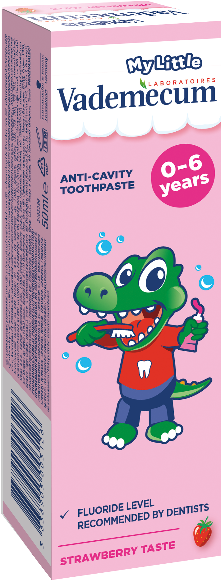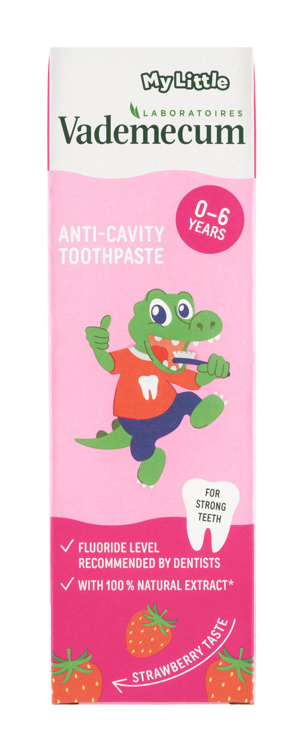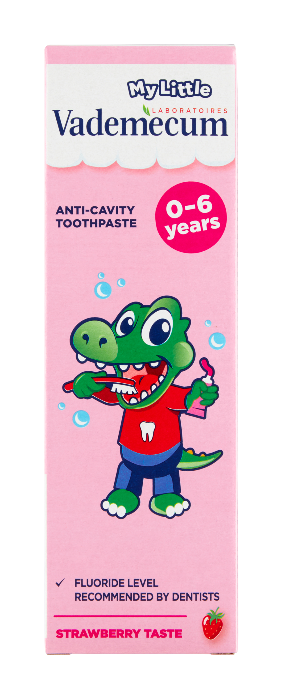 Zubní pasty My Little Vademecum s jemnou jahodovou či jablečnou příchutí jsou určené pro děti do 6 let. Dobrá péče o zuby začíná již začátkem zdravé péče o mléčný chrup, proto je tato pasta vhodná už od útlého věku, jelikož byla speciálně vyvinuta k ochraně proti zubnímu kazu již od prvního zoubku. Díky obsahu kalcia a fluoridu posilují dětské zoubky a pomáhají je chránit před zubním kazem. Obsahuje vhodnou hladinu fluoridu sodného 500 ppmF-.