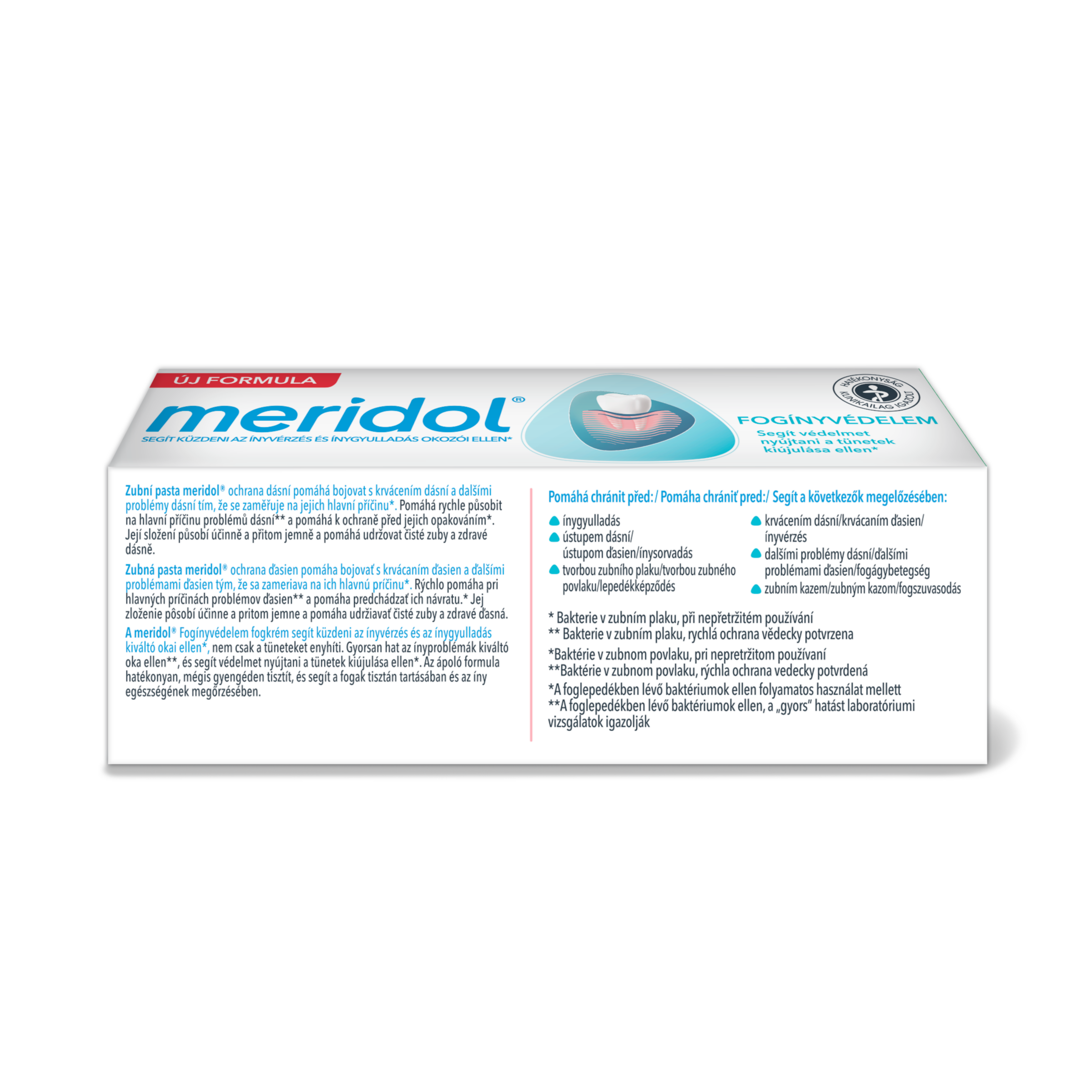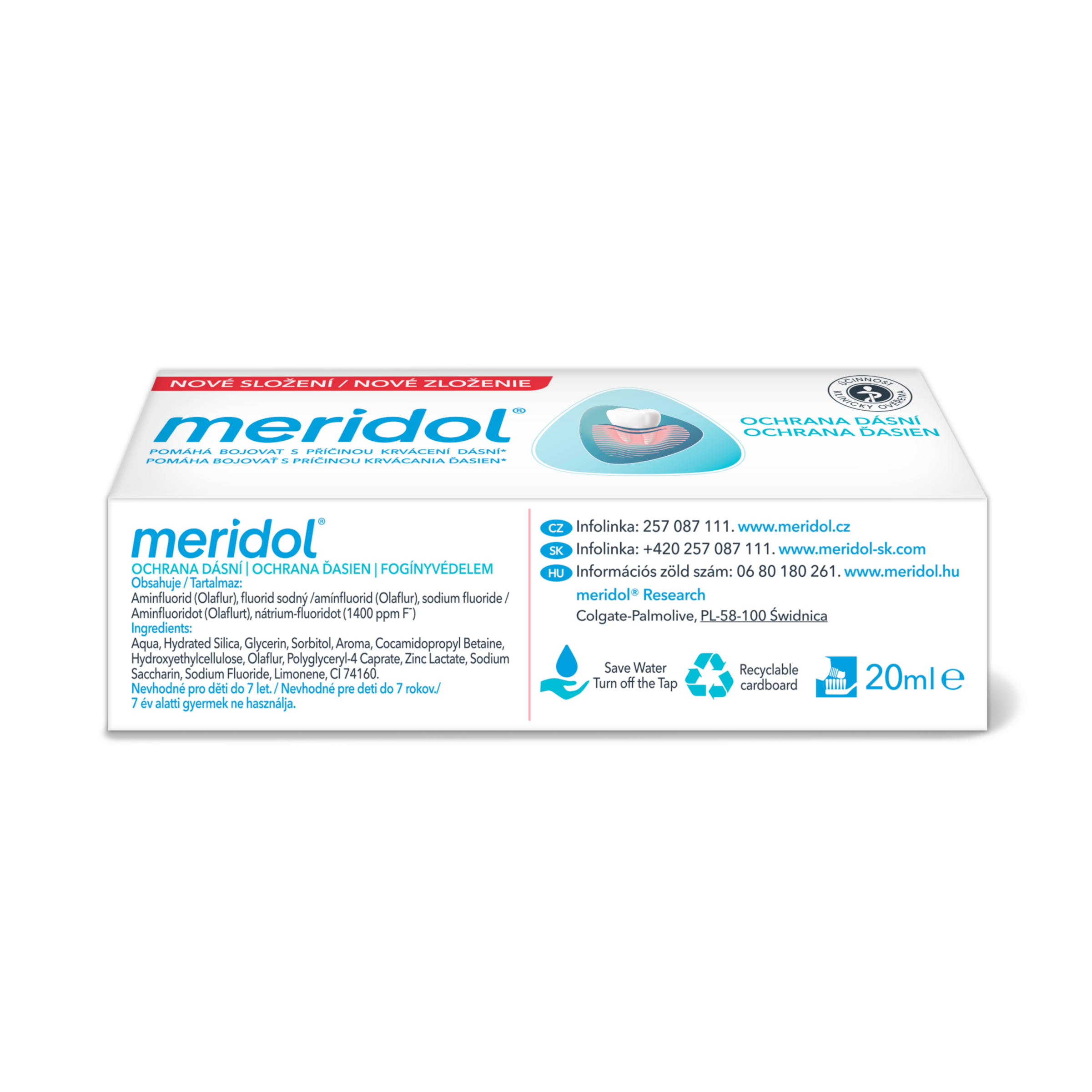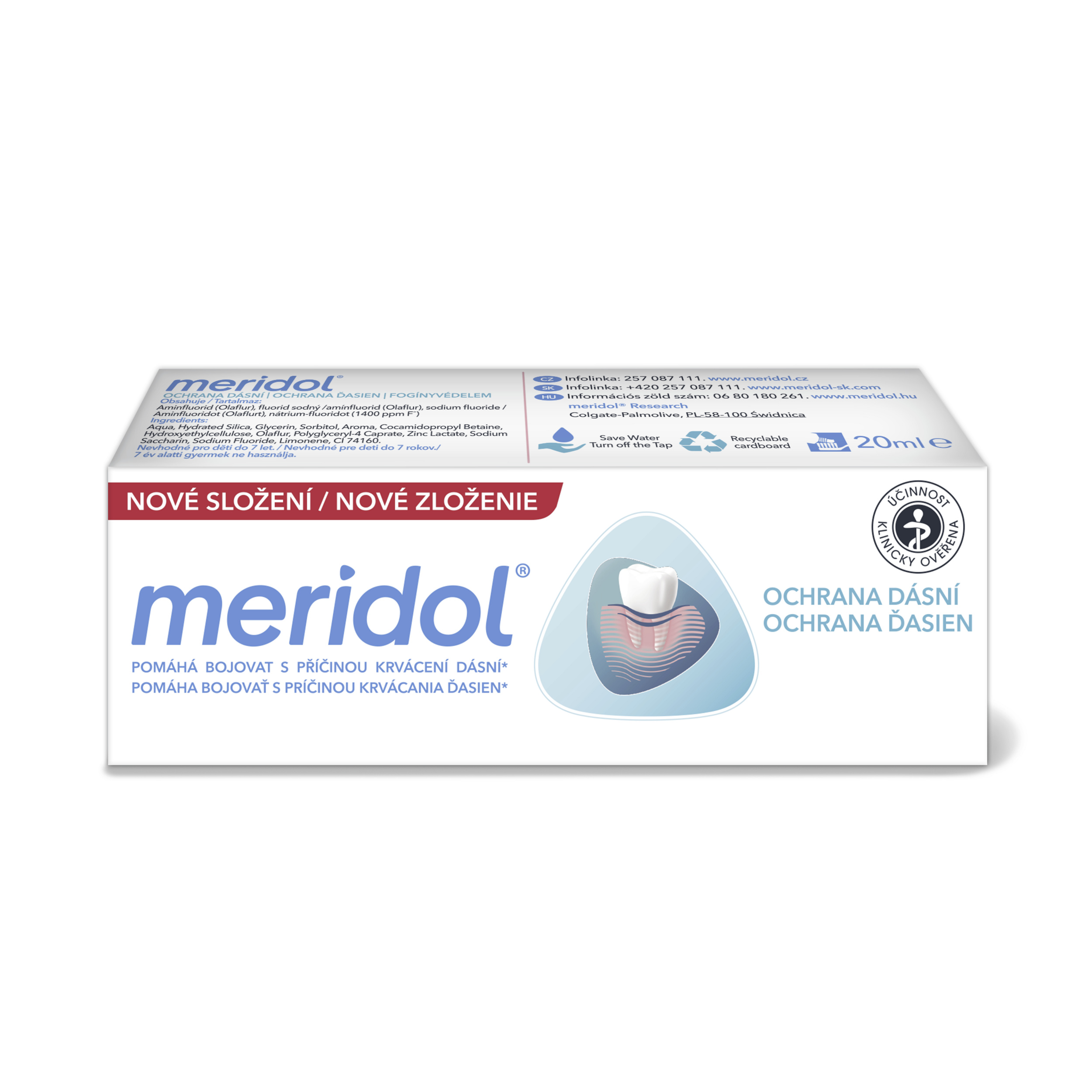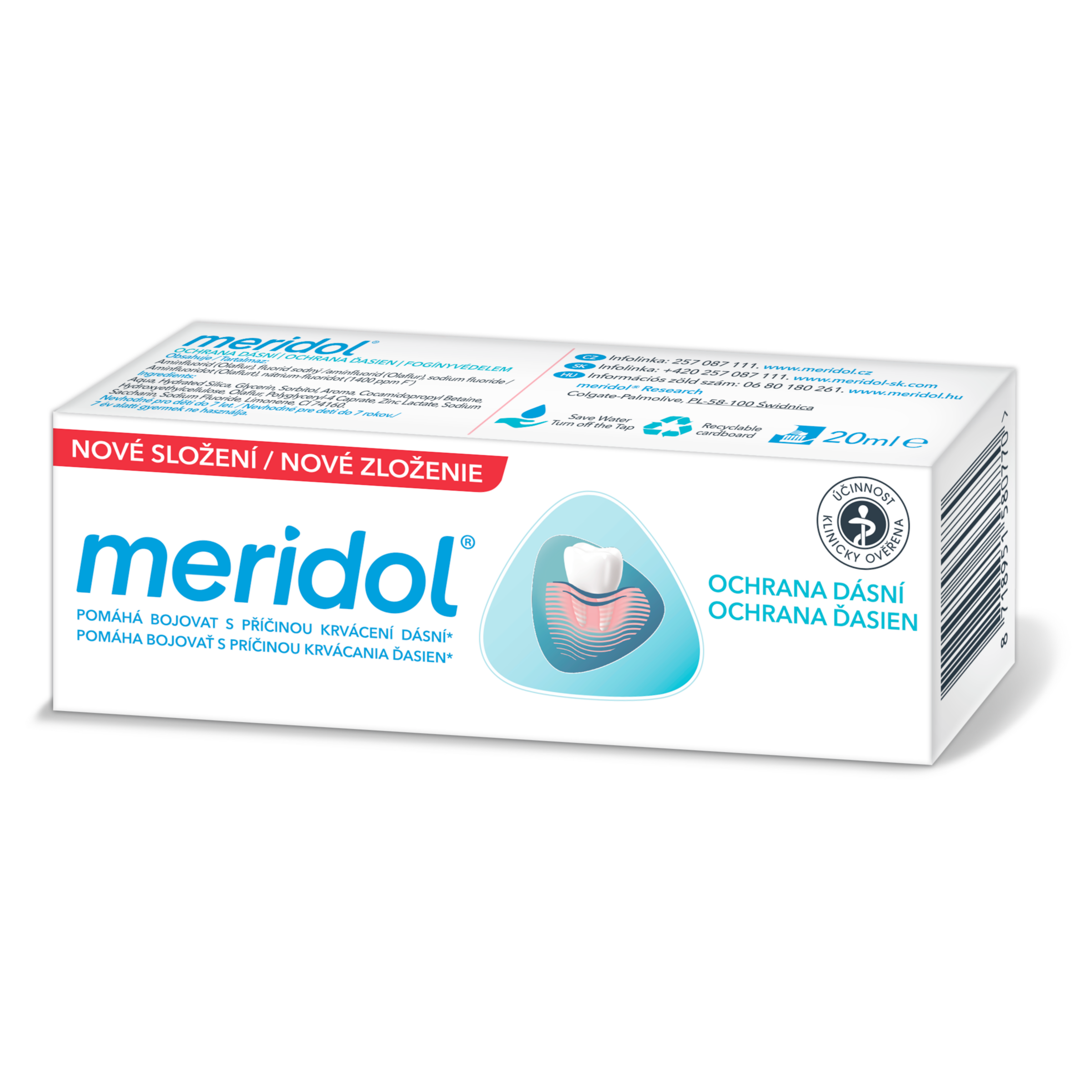 Pečujte o zdraví vašich dásní používáním zubní pasty meridol® Ochrana dásní. Pomáhá bojovat proti bakteriálnímu plaku, který je příčinou 5 problémů dásní¹: krvácení, zánětu, citlivosti, zápachu z úst a zubního kamene. Naše zubní pasta na problémy s dásněmi pomáhá chránit vaše dásně a je 12x účinnější² v boji proti příčinám krvácení a zánětu dásní. Účinnost je nejen klinicky prokázána, ale pasta je také doporučovaná zubními lékaři³. Naše fluoridová zubní pasta vyvinutá ve spolupráci s odborníky na ústní hygienu obsahuje zinek a aminy ve dvojím aktivním složení, které působí společně v boji s bakteriálním plakem a poskytuje rychlou a dlouhotrvající ochranu⁴. Zubní pasta na problémy s dásněmi také pomáhá chránit před zubním kazem, tvorbou plaku, zubním kamenem, zánětem dásní (gingivitida), citlivostí dásní i parodontitidou.
