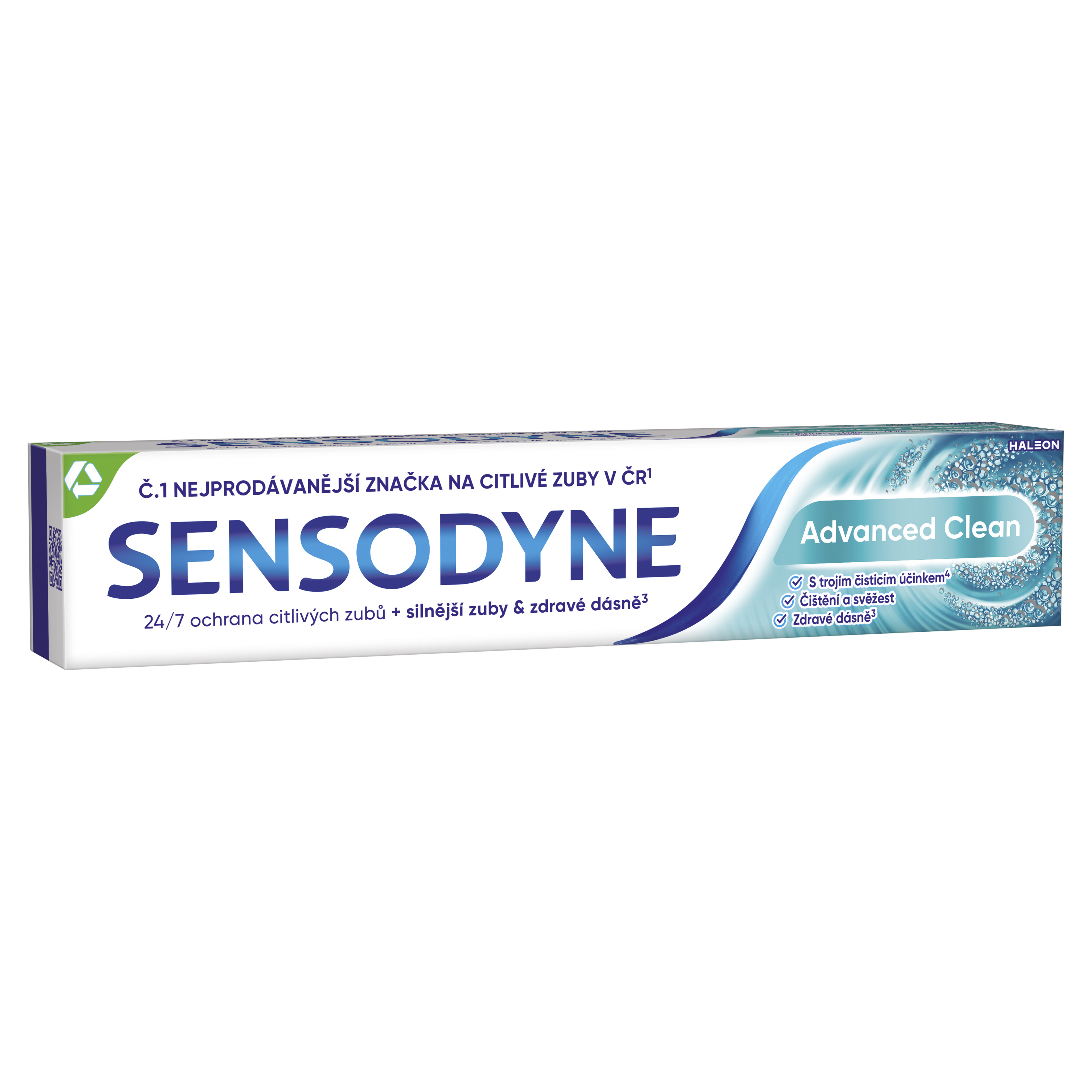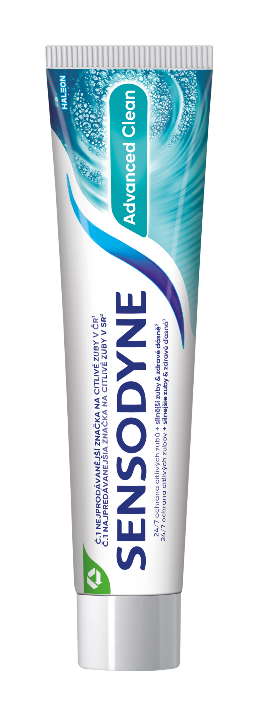 Co Sensodyne poskytuje? Je klinicky testováno, že Sensodyne poskytuje celodenní ochranu citlivých zubů³ a navíc má všechny výhody, které očekáváte od běžné zubní pasty - silnější zuby, zdravé dásně³ a svěží dech. 24/7 ochrana citlivých zubů + silnější zuby³ + zdravé dásně³ + trojí čisticí účinek⁴. Používejte Sensodyne Advanced Clean pravidelně 2x denně: