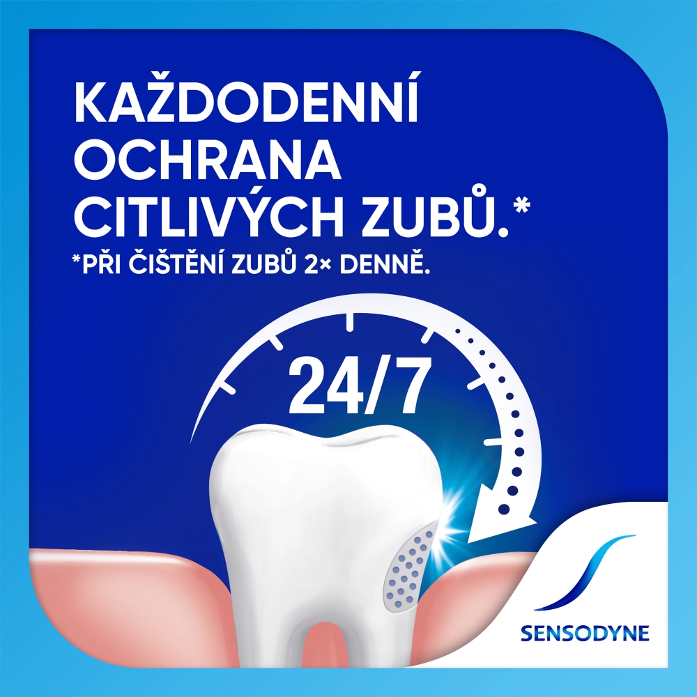 Č. 1 nejprodávanější značka na citlivé zuby v ČR¹. ¹AC Nielsen, ČR Food/Drug celkové prodeje v Kč, zubní pasty na citlivé zuby, 01-12/2024. Šetřete vodou, během čištění zubů ji zastavte.