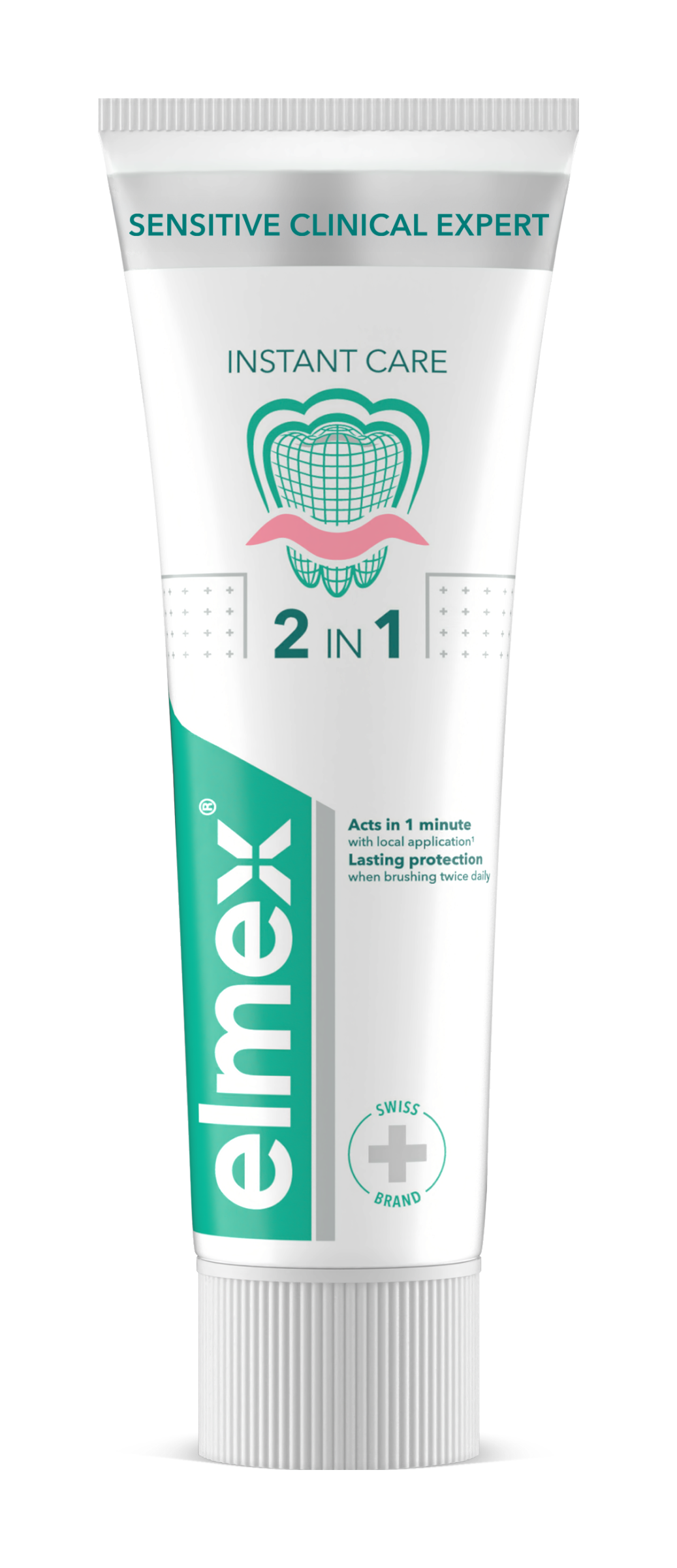 Šetrně pečujte o citlivé zuby se zubní pastou elmex® Sensitive Instant Care. Tato speciálně vyvinutá zubní pasta pro citlivé zuby, která nabízí trvalou ochranu při čištění dvakrát denně, využívá klinicky ověřenou technologii PRO-ARGIN, kterou doporučují zubní lékaři pro osoby s citlivými zuby. Zubní pasta pro citlivé zuby má rychle fungující složení, které působí již za 1 minutu* a při používání dvakrát denně vytváří na obnažených zubních krčcích dlouhotrvající ochrannou vrstvu, která pomáhá chránit před citlivostí. *Pro okamžitou péči jemně vmasírujte špičkou prstu přímo na citlivé místo zubu po dobu 1 minuty až 2x denně a u dětí 7-12 let jednou týdně nebo méně často, před šetrným čištěním zubů. Pro dlouhodobou ochranu naneste na měkký zubní kartáček a čistěte zuby 2x denně.