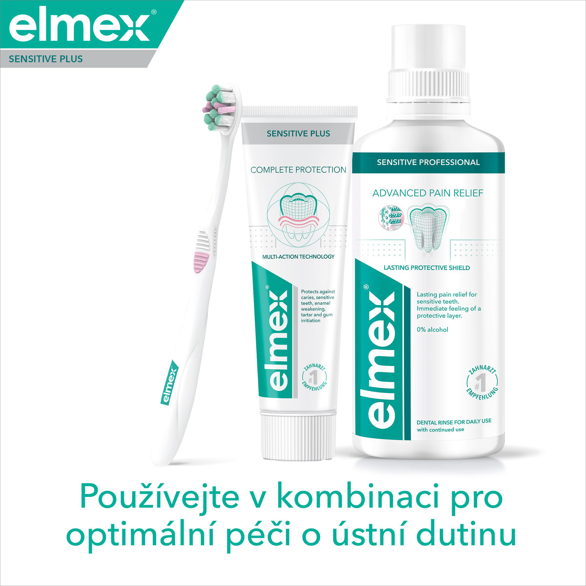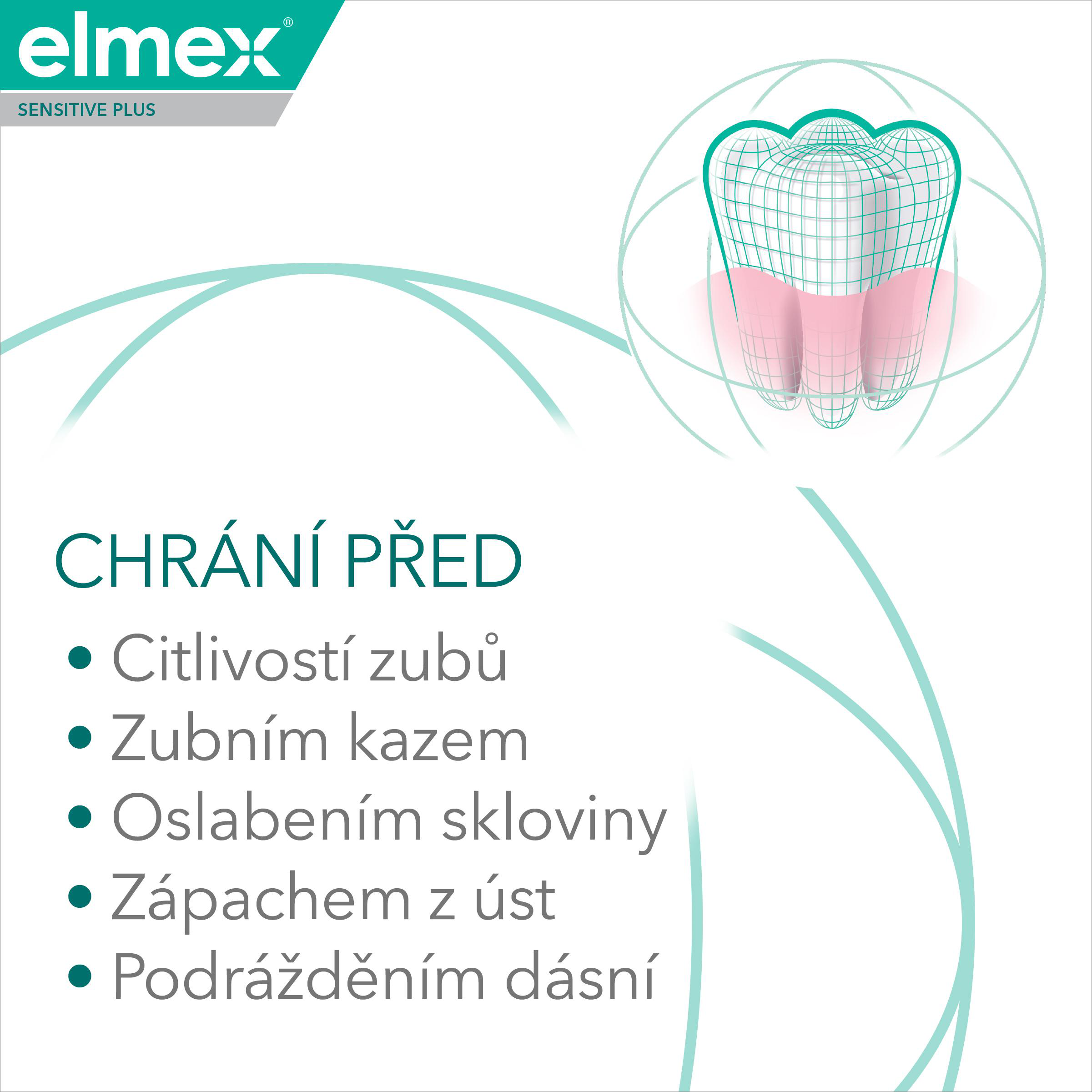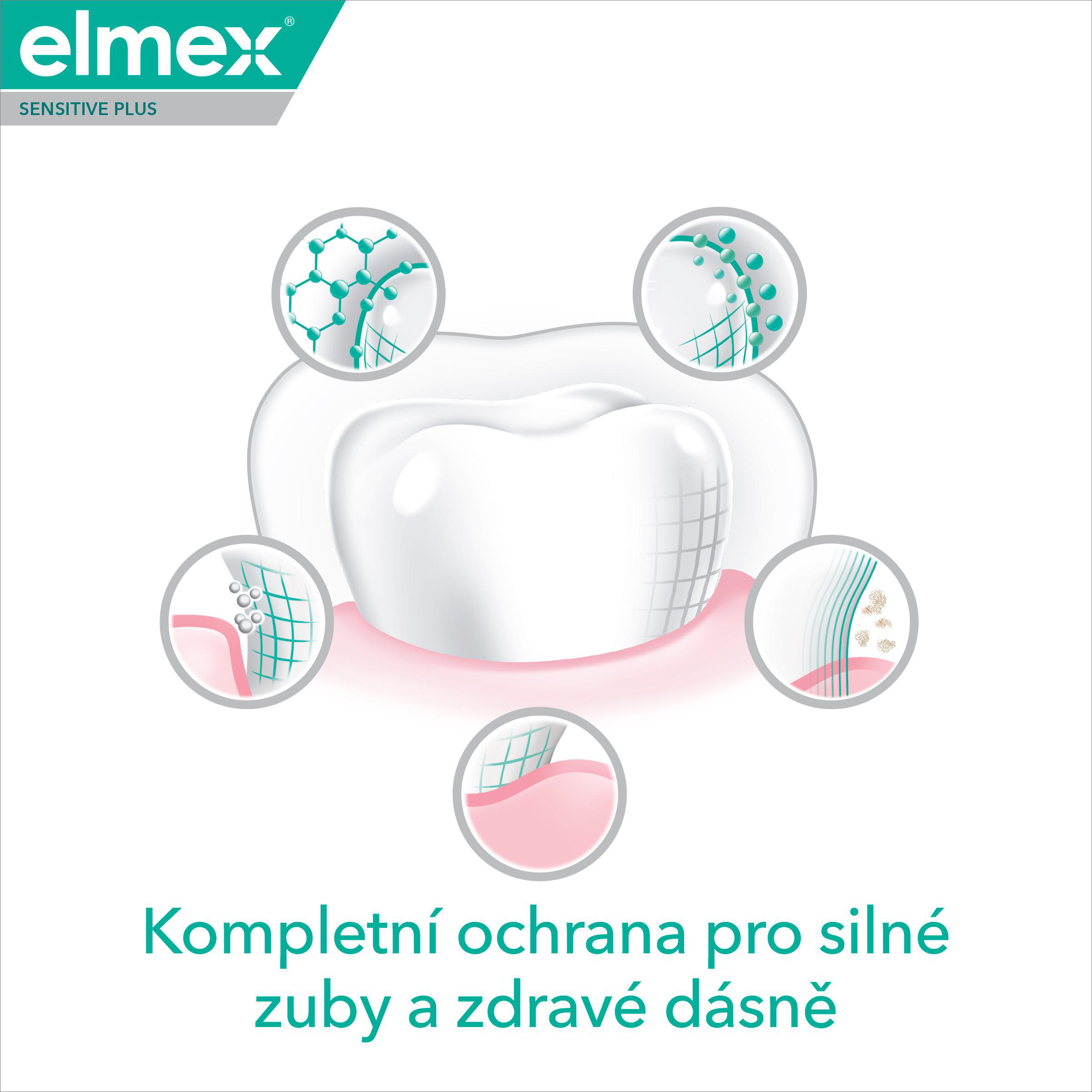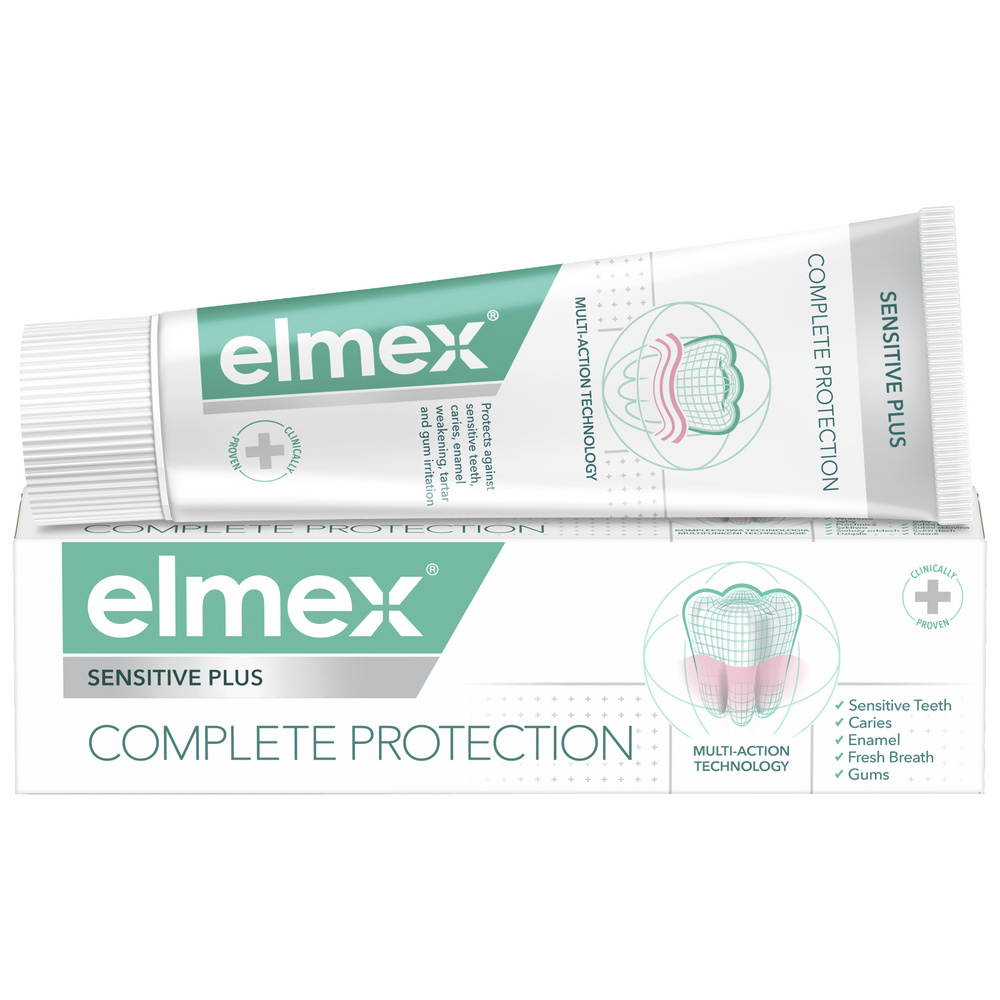 Zubní pasta elmex® Sensitive Plus Complete Protection je zubní pasta pro citlivé zuby s obsahem fluoridu cínatého a fosforečnanu zinečnatého, které poskytují kompletní ochranu pro zdravá ústa.