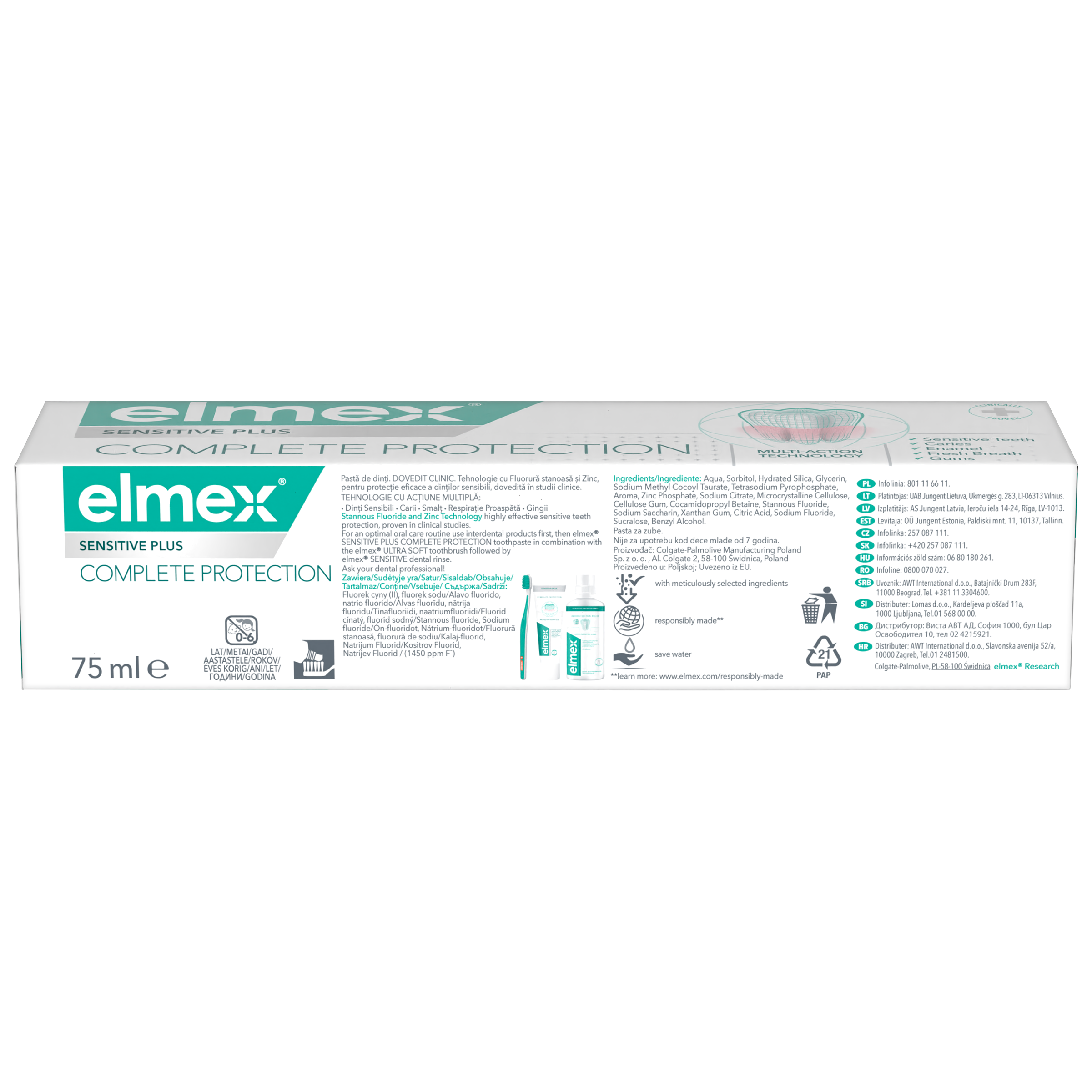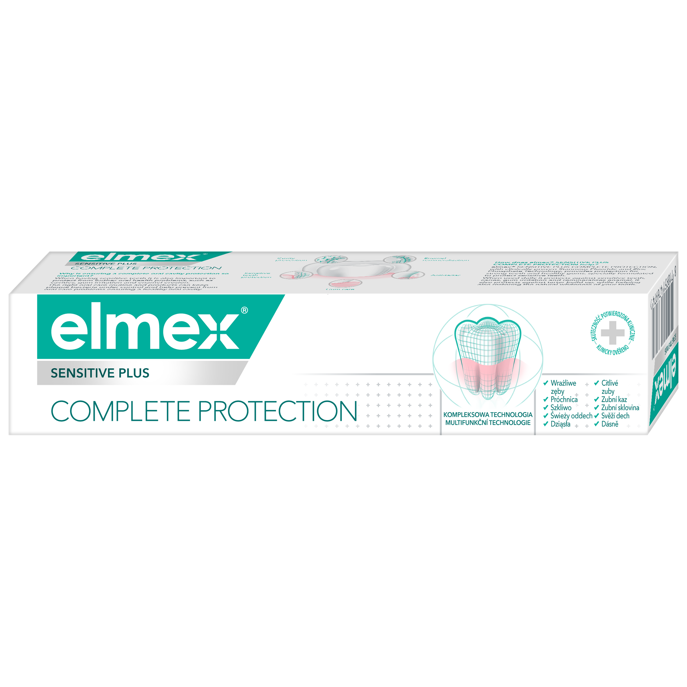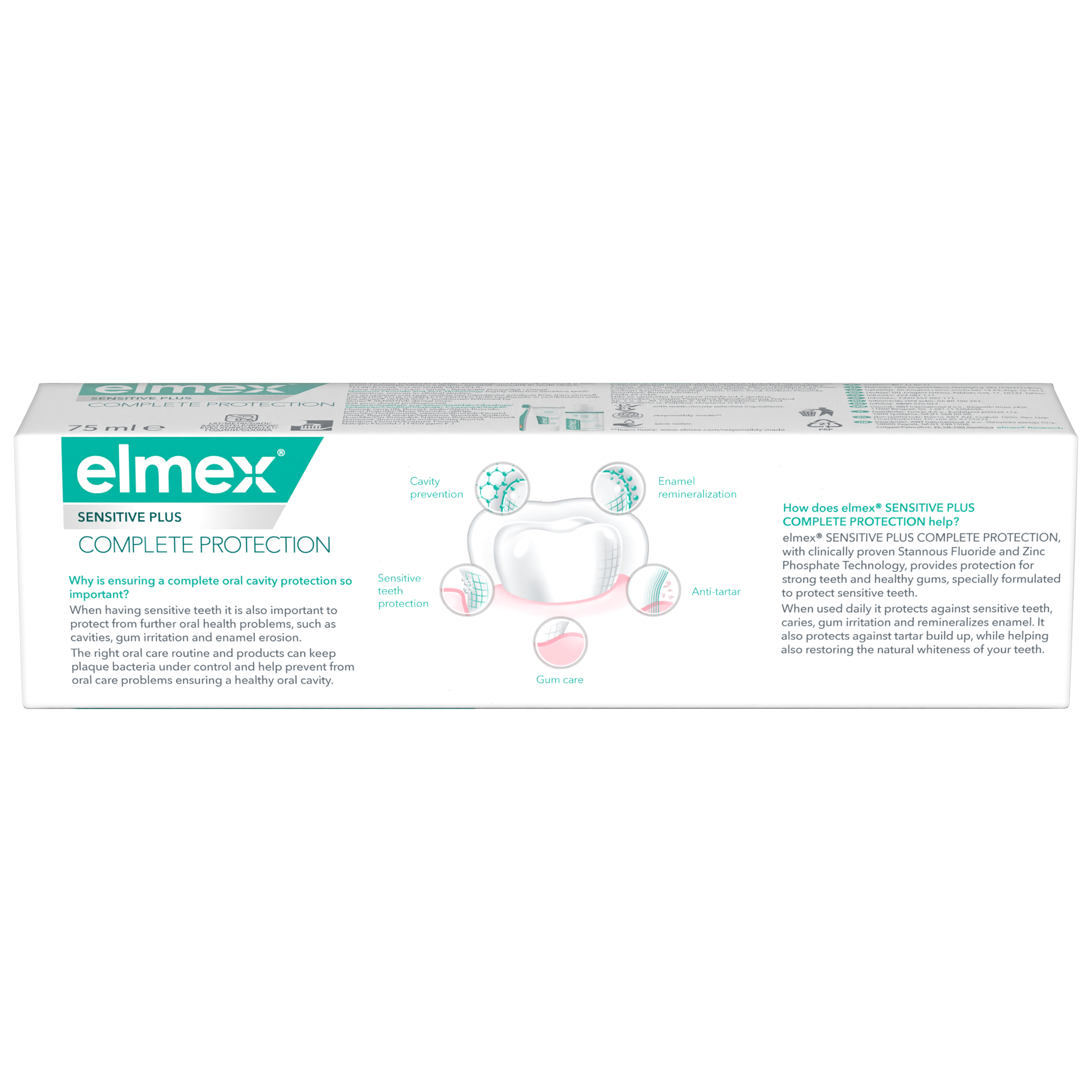 Pečujte efektivně o svá ústa a citlivé zuby pomocí zubní pasty elmex® Sensitive Plus Complete Protection. Tato zubní pasta obsahuje klinicky ověřenou technologii fluoridu cínatého a fosforečnanu zinečnatého, které poskytují ochranu pomáhající udržovat silné zuby, zdravé dásně a zároveň chránit citlivé zuby. Při každodenním používání tato zubní pasta pomáhá chránit před zubním kazem, podrážděním dásní, před usazováním zubního kamene a zároveň remineralizovat sklovinu. Pomáhá také obnovovat přirozenou bělost vašich zubů. Pečujte o své zuby a ústa pomocí zubní pasty elmex® Sensitive Plus Complete Protection.