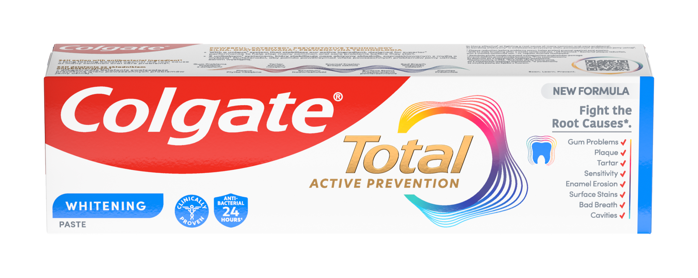 Péče o zdraví vašeho úsměvu a jeho ochrana začíná dříve, než se objeví problémy se zdravím úst. Proto přichází zubní pasta Colgate Total Active Prevention Whitening s novým, vědecky navrženým složením pro aktivní prevenci a bojem proti hlavním příčinám* mnoha problémů s ústním zdravím³. S klinicky ověřenou 24hodinovou antibakteriální¹ ochranou a unikátním² systémem, který stabilizuje aktivní prevenční složku, je určena pro maximální⁴ výkon. Přesně to, co potřebujete, abyste ochránili svůj úsměv před budoucími problémy s ústním zdravím. A s pokročilým bělicím systémem, který odstraňuje o 35 % více povrchových skvrn⁵, je také vhodnou bělicí zubní pastou. Kromě čištění a bělení zubů pomáhá účinná, patentovaná², prevenční technologie v zubní pastě Colgate Total Active Prevention Whitening s 8 ústními zdravotními problémy: Problémy s dásněmi 1.Problémy s dásněmi 2.Plak 3.Zubní kámen 4.Citlivost 5.Eroze skloviny 6.Povrchové skvrny 7.Zápach z úst 8.Zubní kazy S pastou Colgate Total Active Prevention Whitening si můžete být jistí, že je váš úsměv chráněn. *Redukce plaku před vznikem problémů; pomáhá chránit sklovinu před erozí kyselin. ¹Při čištění dvakrát denně po dobu 4 týdnů. ²Patentováno v USA. ³Redukce bakteriálního plaku při pokračujícím používání po dobu 3 měsíců. ⁴Oproti běžné fluoridové zubní pastě. ⁵Oproti nebělicí zubní pastě po 6 týdnech používání dvakrát denně.