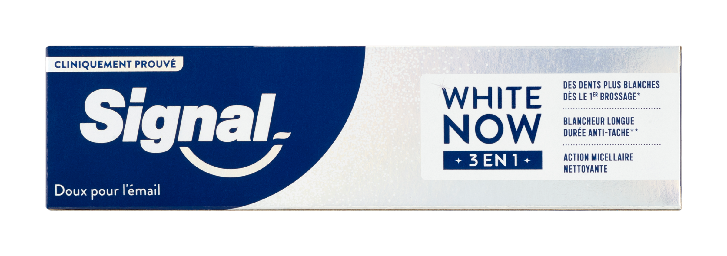 Zubní pasta White Now 3in1 od Signal přináší okamžitý efekt bělejších zubů, zatímco dlouhodobě obnovuje jejich přirozený jas a zdraví. Tato inovativní pasta kombinuje trojici účinků: okamžité zesvětlení zubů, účinné odstranění skvrn a ochranu dásní – pro každodenní péči i zářivý úsměv bez kompromisů. Technologie White Now využívá modré pigmenty, které opticky neutralizují žlutý tón skloviny již po prvním použití. Aktivní složky zároveň působí proti zažloutnutí způsobenému věkem, jídlem či nápoji, a zanechávají zuby vizuálně mladšími. Ideální volba pro ty, kdo chtějí dodat svému úsměvu svěží jiskru.