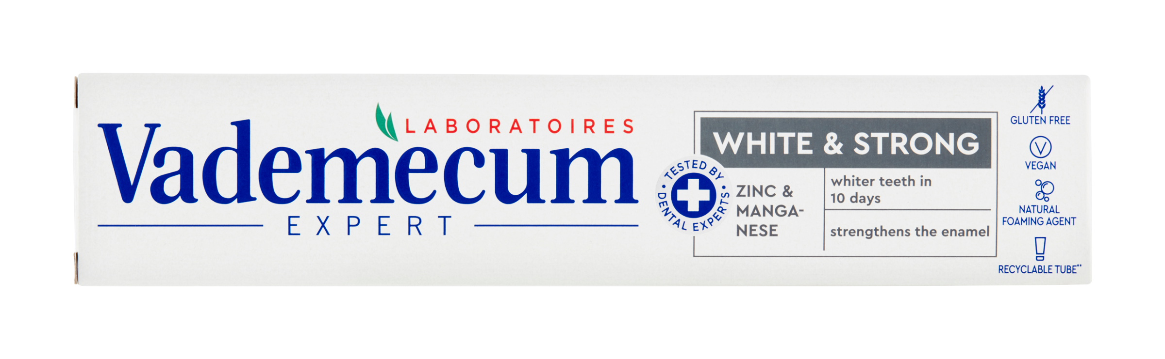 Vademecum White & Strong se zinkem a manganem: Receptura zubní pasty jemně odstraňuje skvrny a bělí vaše zuby již za 10 dní*, posiluje zubní sklovinu a odstraňuje až 99 % bakterií. S přírodním pěnidlem. 100% recyklovatelné balení. Obsahuje fluorid sodný (1 450 ppm F⁻).
