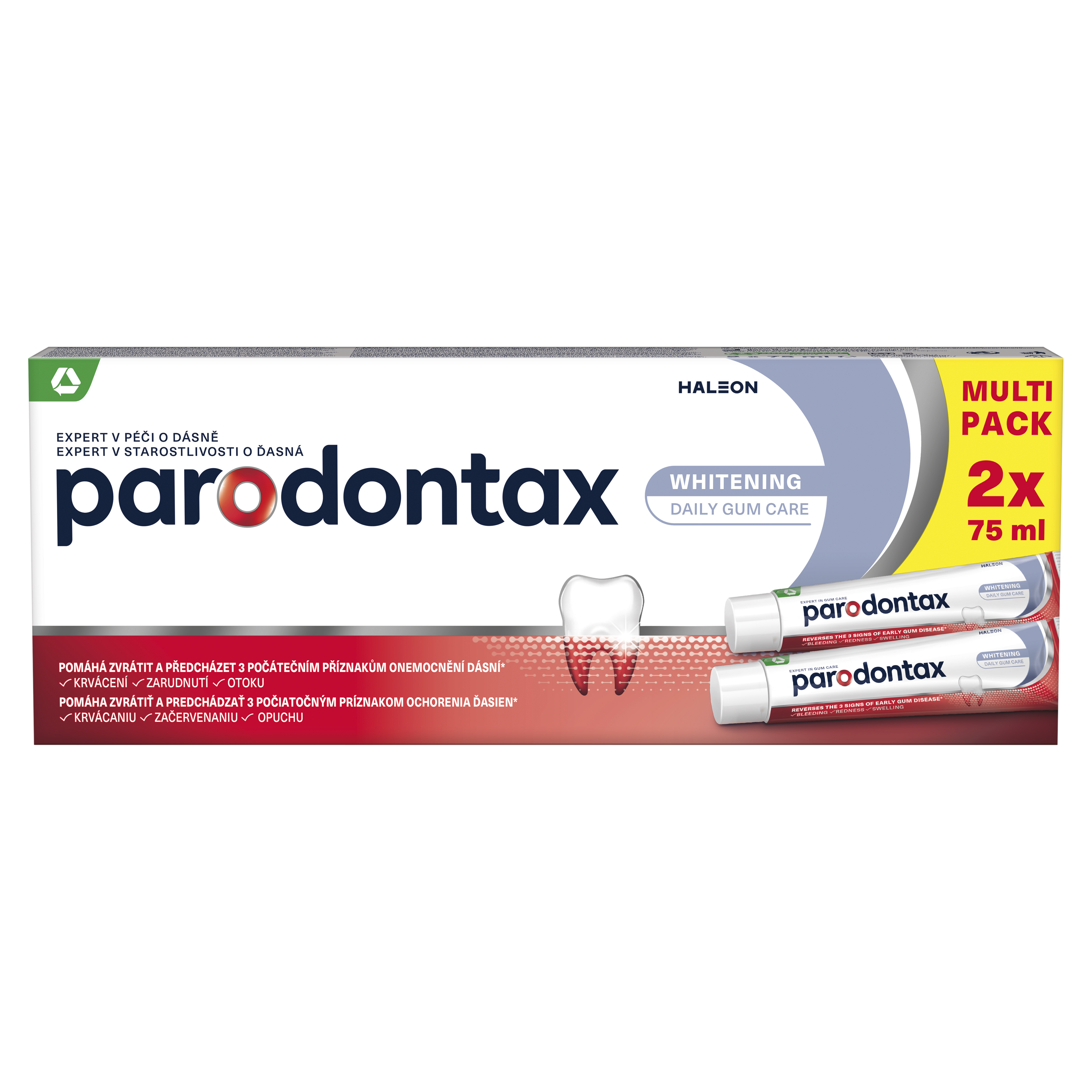 Zubní pasta ke každodennímu použití s obsahem fluoridu pro zdravější dásně a silnější zuby. Zubní pasta parodontax Whitening jemným odstraňováním povrchových skvrn pomáhá obnovit přirozenou bělost zubů. Pomáhá zastavit a předcházet krvácení dásní*. Vylepšená chuť.